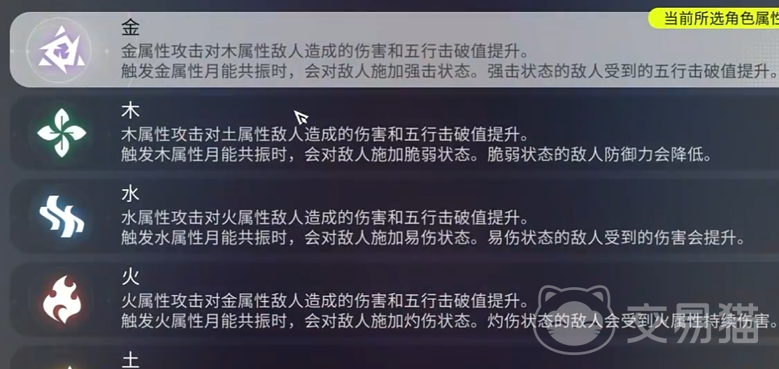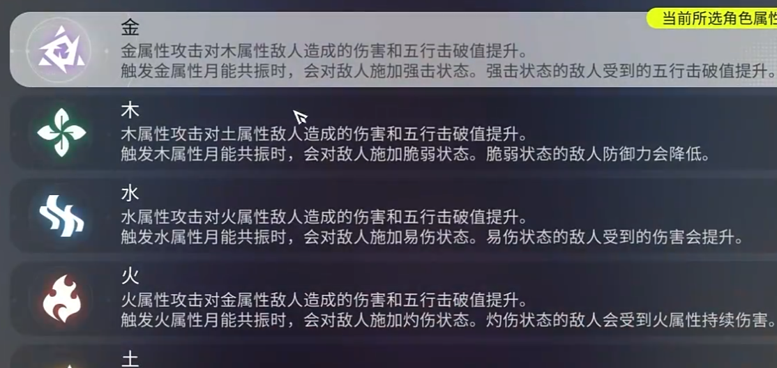 火属性克制金属性:对金系目标提升击破值;月能共振成功后,将对敌人施加“灼烧”,使其在持续时间内承受火属性持续伤害;土属性克制水属性:对水系目标提升击破值;月能共振触发后,将赋予敌人“钝化”状态,使其对我方造成的伤害降低。