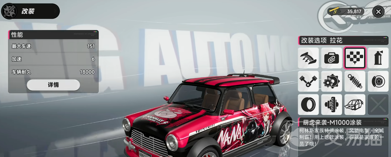 需特别注意的是,该涂装具有严格绑定关系:仅适配M1000车型。该载具需通过游戏内车行商店购入,售价亲民,基础外观为绿色,造型简洁朴素。但一旦应用痛车涂装,整车气质将发生质变——红黑配色强化了运动感与个性表达,显著区别于其他常规车辆,在城市道路中行驶时具备极高辨识度。