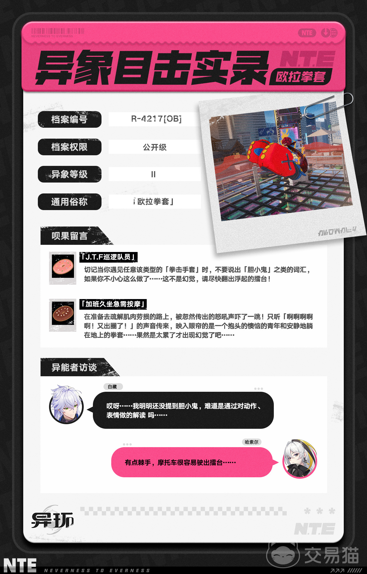 当前版本中,玩家可通过两种稳定路径获取该武器,整体门槛较低,新手也能快速上手。其一为剧情任务线直取:完成“后街调查”专属任务后,系统将直接发放欧拉拳套,全程无消耗、无等级或战力限制;其二为半角街区异象收容——在探索过程中遭遇异常情绪类异象体并成功收容,即有概率掉落该武器。此外,参与异象挑战活动亦可重复获取,进一步提升获取容错率。