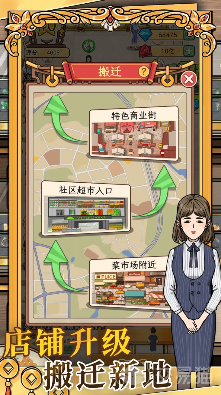 随着店铺评分提升与营收增长,玩家可解锁更多优质铺位选项,例如搬迁至人流量密集的特色商业街区、社区中心出入口或高端商场一层等黄金地段,逐步实现从单店起步到区域知名金店的品牌跃迁。