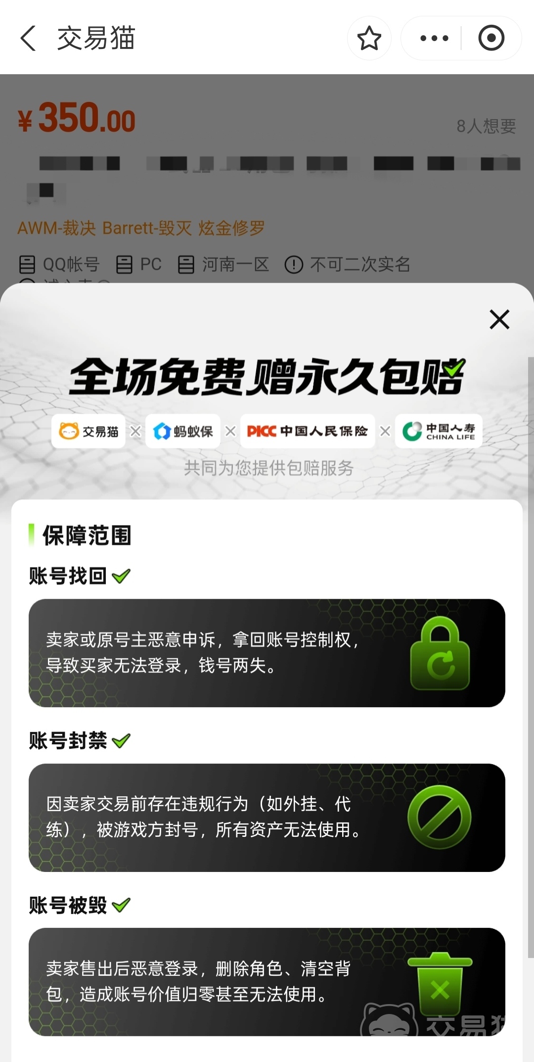 除估值能力外,平台构建了贯穿交易全链路的安全闭环。针对账号找回、信息造假、换绑失败等高频风险,交易猫实行“平台托管式履约”:所有待售CF账号须经平台统一接管,完成实名核验、密保重置、设备解绑、异地登录检测等7道风控动作后,方可进入上架流程;买家付款后,账号由平台直发,全程无卖家接触权限。同时,平台对标注“永久包赔”的CF账号提供兜底保障——若发生账号被原主找回、因历史违规遭封禁、或绑定信息与描述严重不符等情形,将在48小时内启动全额赔付,赔付资金由平台保证金池实时划转。
