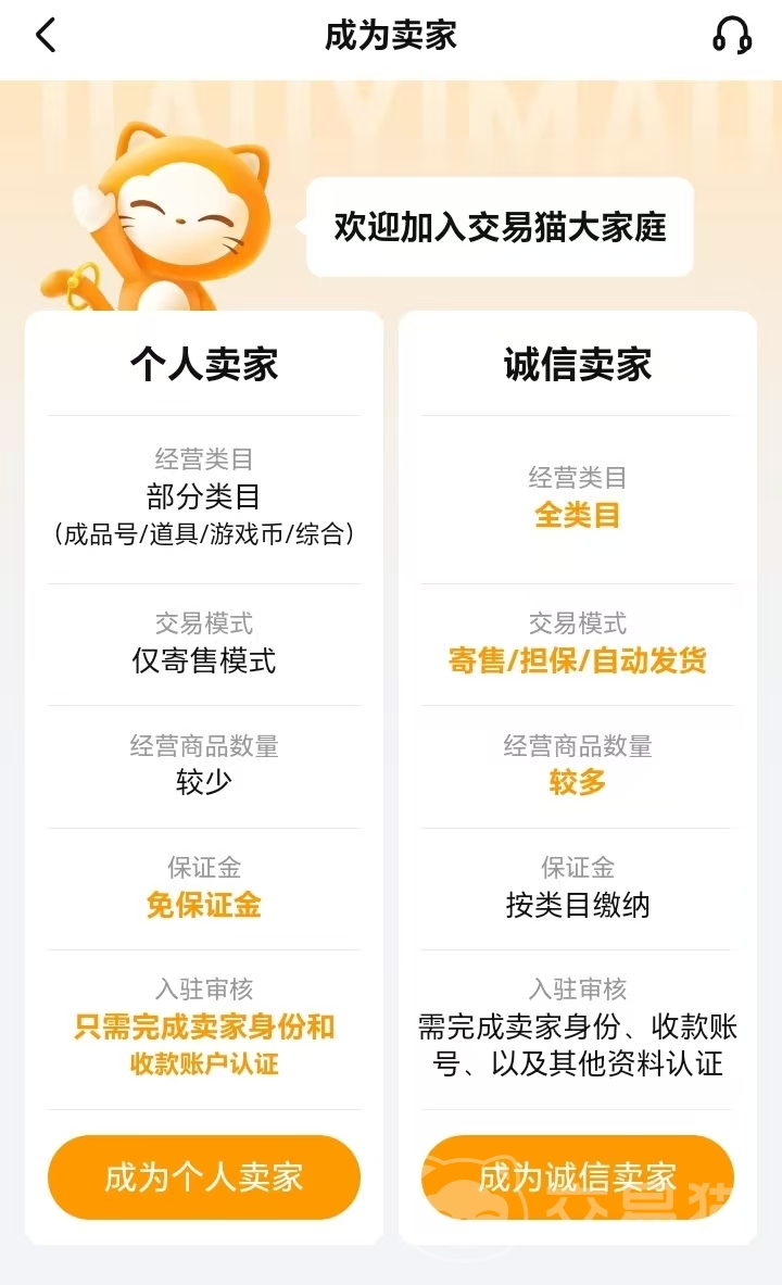 卖家入驻流程简洁透明:在“我的”页面选择“成为卖家”,可自由切换两种模式——个人卖家零保证金开通,适合单次或低频交易用户;诚信卖家需缴纳基础保证金,享有更高商品上架额度与优先推荐权益。用户可根据自身账号数量、交易频率及长期规划灵活选择。