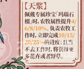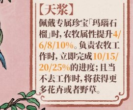 二技能“天浆”需装备专属珍宝“玛瑙石榴”方可激活:激活状态下,农牧属性提升4%–10%,且在执行农牧任务时,进度条将即时完成10%–25%;同时,若触发拒绝工作机制,所获花卉或野草数量将高于常规产出。