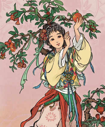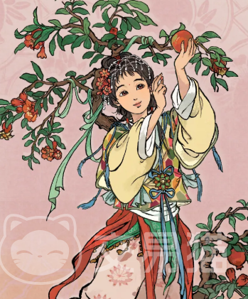 角色形象清丽灵动,头饰采用盛开的石榴花造型,姿态轻盈,正踮脚采摘枝头熟透果实。神情中流露愉悦与专注,契合其“精于农耕、长于畜牧”的核心定位,实装后将在农牧类建筑工作中提供显著属性加成。