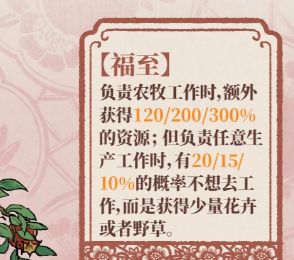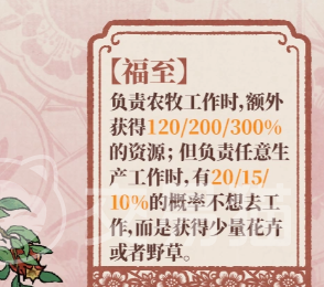其一技能名为“福至”:当安排至农牧类工作时,资源产出提升至基础值的300%;若被指派至非农牧类生产岗位,则有10%–20%概率拒绝执行任务,并随机产出少量花卉或野草。