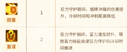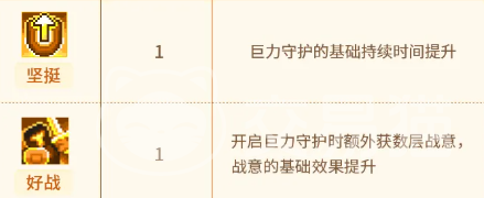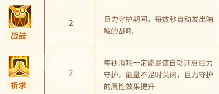 第四项【蓄谋】加快技能蓄力速度,并在蓄力技命中时重置“巨力守护”的冷却计时; 第五项【战鼓】使角色在守护期间,每隔固定秒数自动触发一次群体战吼效果; 第六项【祈求】启用能量自动管理模式:当能量充足时持续激活“巨力守护”,能量不足则自动关闭。