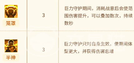 第七项【笼罩】允许在技能持续期间,主动消耗战意层数以提升范围伤害输出,该效果支持多层叠加; 第八项【半神】将技能作用目标限定为自身,触发后角色体型增大,并获得全局伤害总增效果。