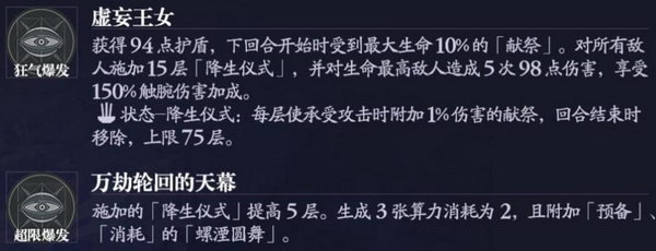 在合理配置下,诞墨每回合可稳定释放2–4张「深海圣咏」,该卡牌为0费,兼具过牌与算力回复双重效能;其3费技能「螺湮圆舞」可大量生成银钥能量,并依据当前触手形态赋予差异化增益——实战中优先选择蓝触形态,用以提升触手伤害倍率及数量上限,从而放大整体输出曲线。融毁·多尔担任生存辅助位,提供狂气强效增益、持续治疗、固伤爆发及抽牌回算能力,是队伍容错率的关键保障。