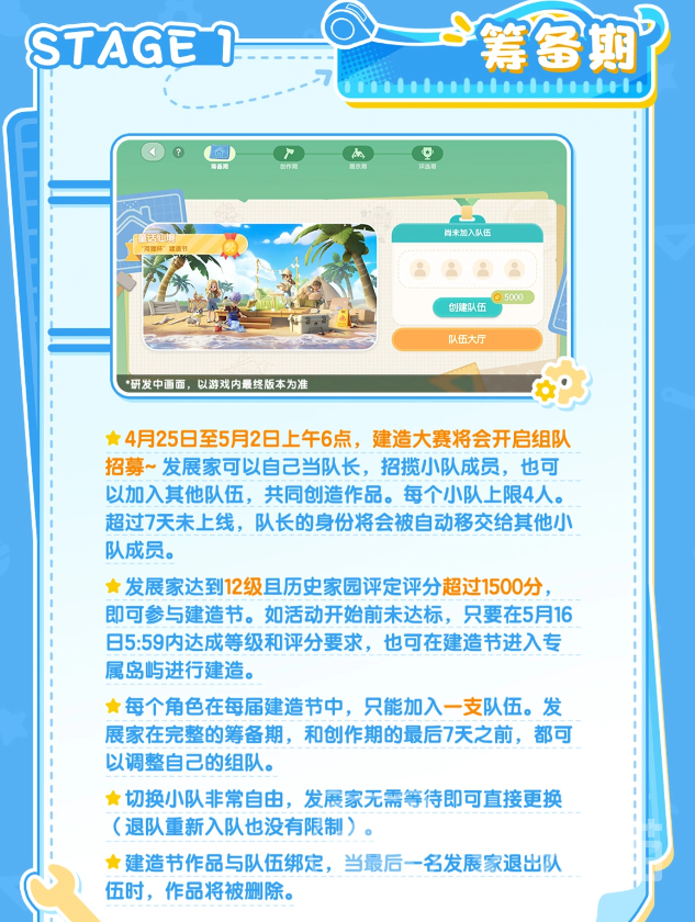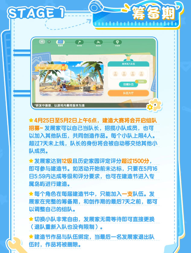 筹备期自4月25日启动,至5月2日结束。此阶段主要完成组队工作。活动采用4人小队制,每位玩家仅可归属一支队伍。队长需主动发起组队邀请,队员亦可自主申请加入他人队伍。若队长连续7日未登录游戏,系统将自动将队长权限转移至队内最近活跃成员。参与门槛明确:玩家角色等级须达12级,且历史家园综合评分不得低于1500分。