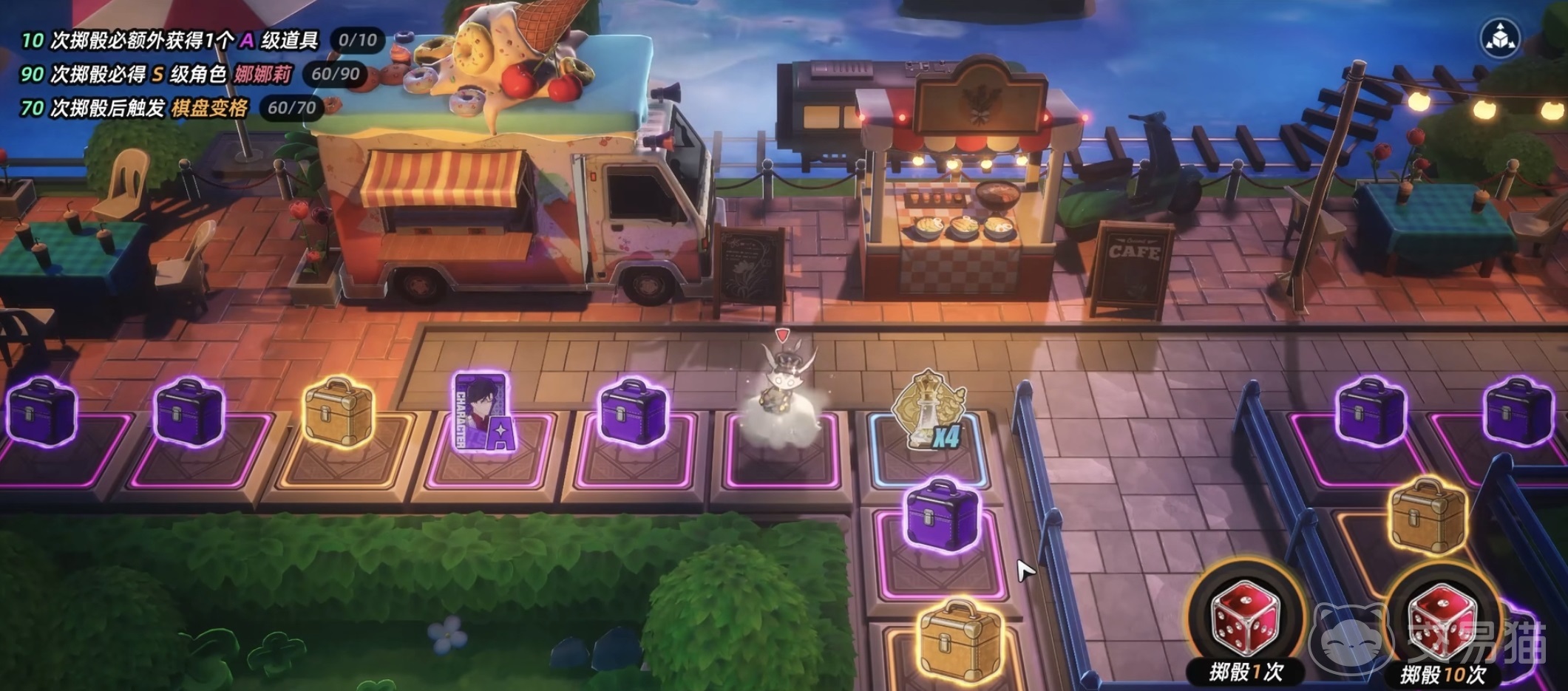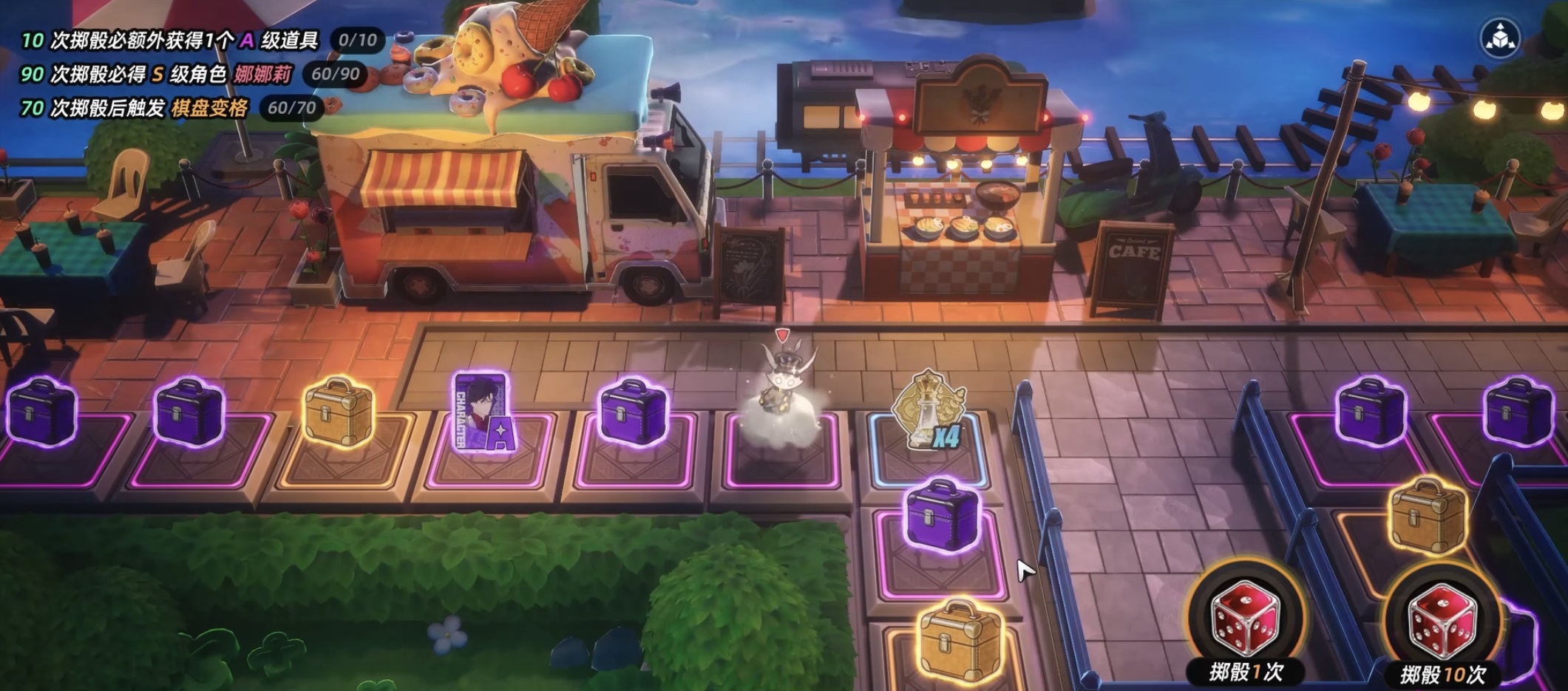 棋盘格子按功能划分为四类:角色格、宝箱格、资源格与特殊格。角色格提供100%确定性获取对应角色;宝箱格按品质分为紫色与金色,内含S级角色、高阶武器或B级弧盘,其中勇者宝箱具备更高概率产出稀有物品;资源格稳定掉落角色突破材料、武器精炼素材及金币等成长必需资源;特殊格则触发“再来一次”或“多重惊喜”等额外交互效果。