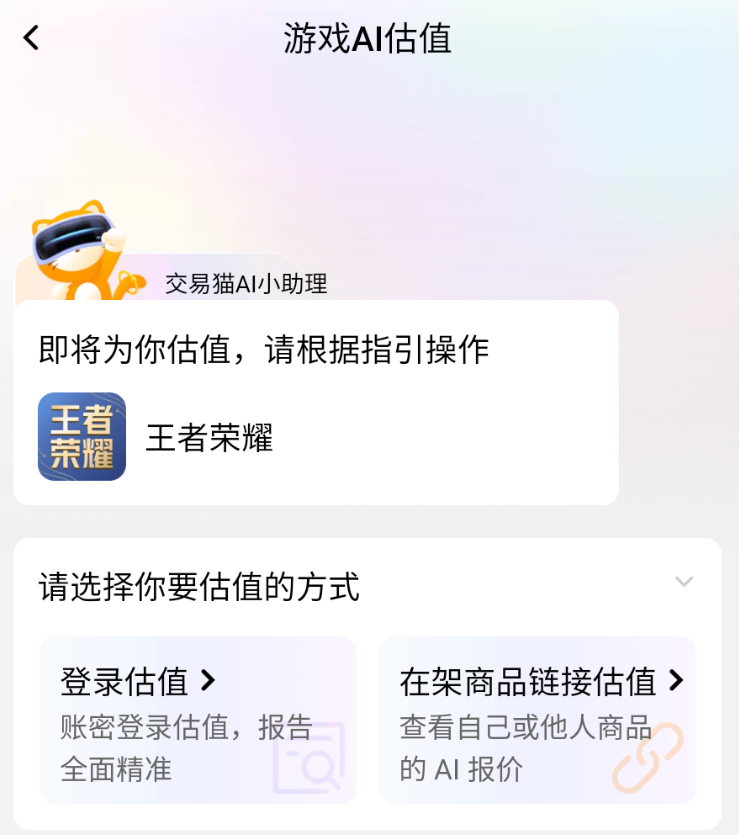 针对出售方,交易猫提供智能估值服务。该功能依托阿里巴巴灵犀互娱旗下AI技术能力,整合海量历史成交数据与实时市场波动模型,实现对账号资产的精准评估。用户可通过“登录账号自动估值”或“粘贴商品链接估值”两种方式操作,全程无需人工介入,3–5分钟即可获取具有参考价值的价格区间,为合理定价提供数据支撑。