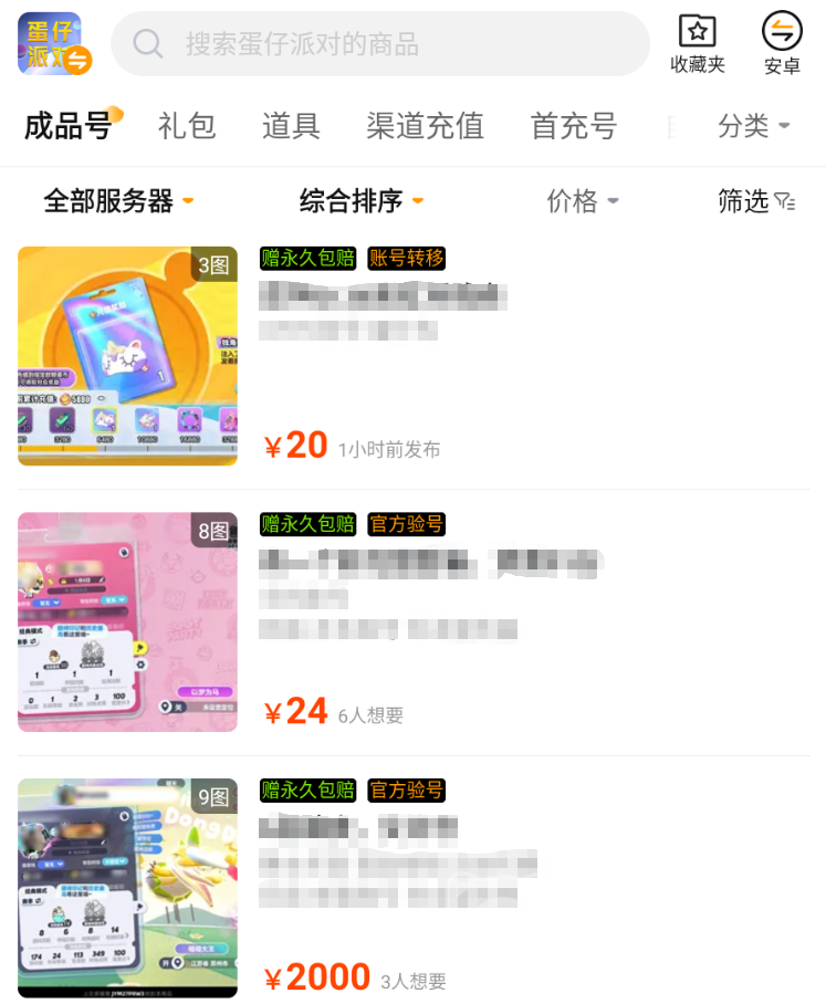 交易猫是当前国内主流的游戏账号交易平台之一,由阿里巴巴灵犀互娱旗下运营,与九游、biubiu加速器同属同一产品矩阵。依托成熟的技术体系与合规运营机制,平台在账号交易安全性、流程标准化及售后响应效率方面具备较强公信力。进入平台后,用户可通过搜索“蛋仔派对”直达专属交易频道,并借助价格区间、渠道类型(如官方服、小米服、OPPO服、九游服等)、上架时间等多维筛选条件,快速定位符合预期的在售账号。