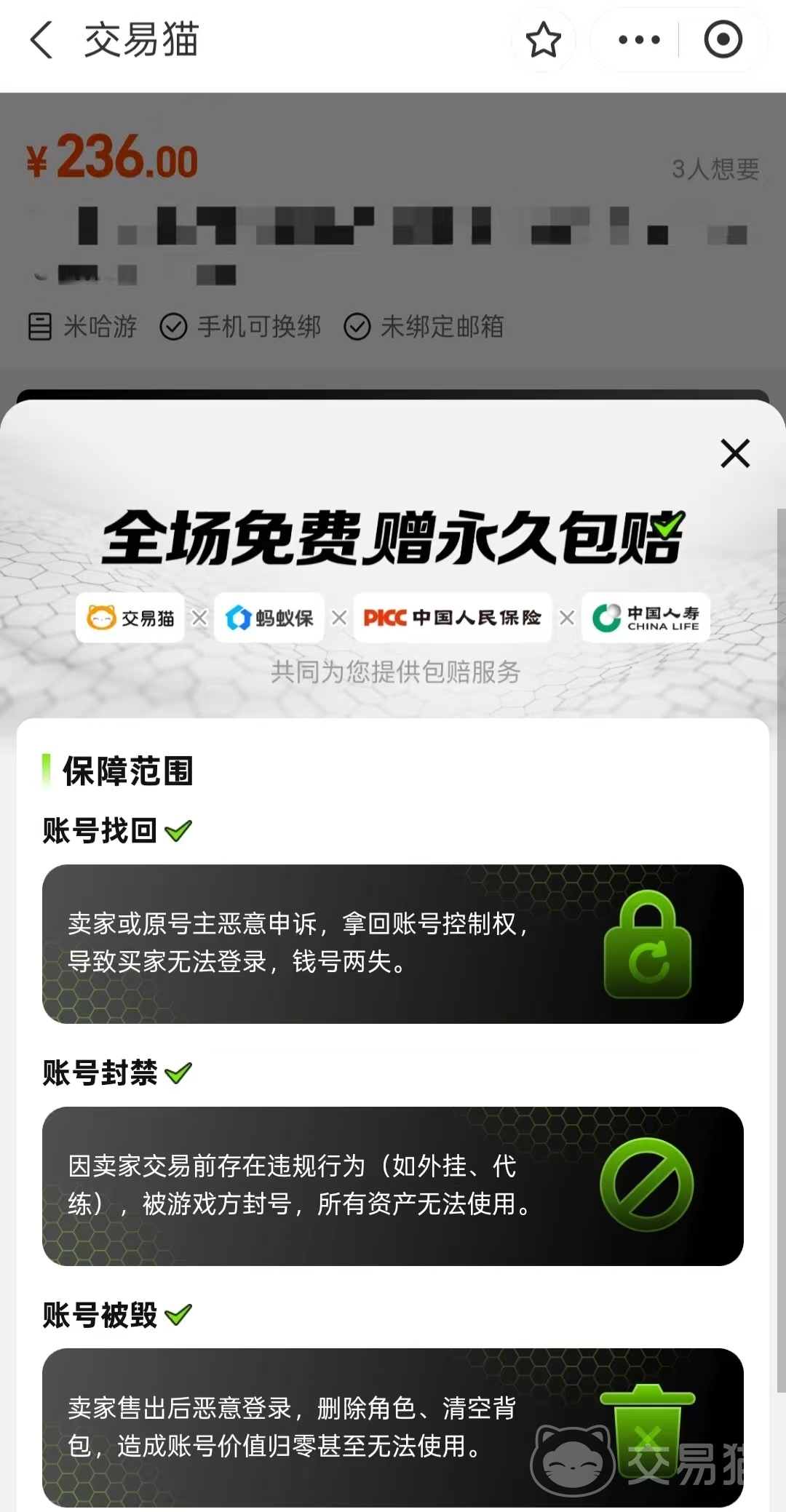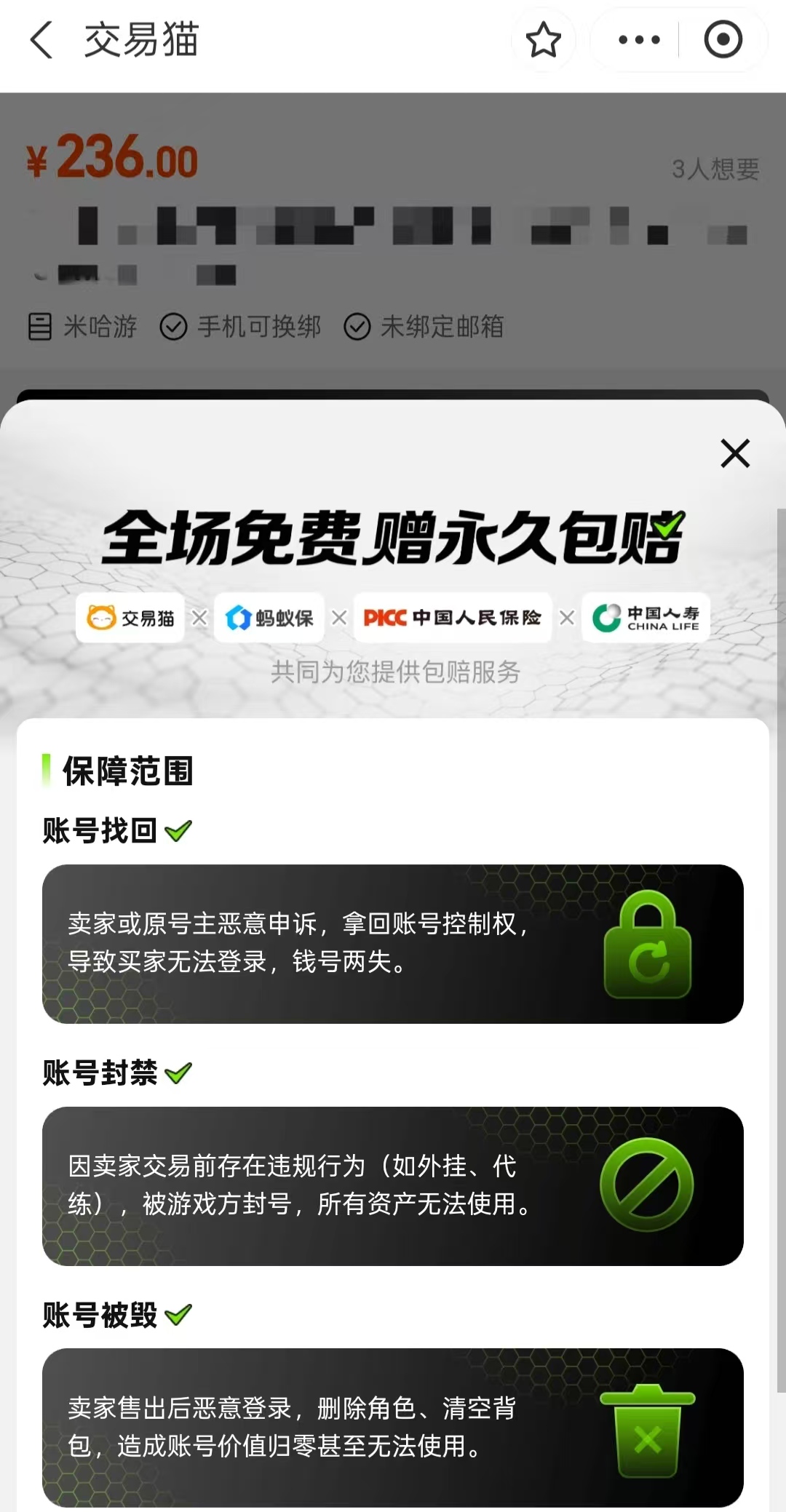 在售后服务方面,也值得好好夸一句。不管是交易过程中遇到任何问题,还是交易完成后出现了什么状况,随时都能找到客服。客服是全天24小时在线的,而且响应很及时,绝对不会出现那种出现问题就找不到人、投诉无门的情况。更让人放心的是,平台推出了“永久包赔”的保障服务,一旦出现账号被找回、封禁、恶意毁坏等异常情况,凭交易凭证就可以申请赔付,最高可以拿到全额退款。