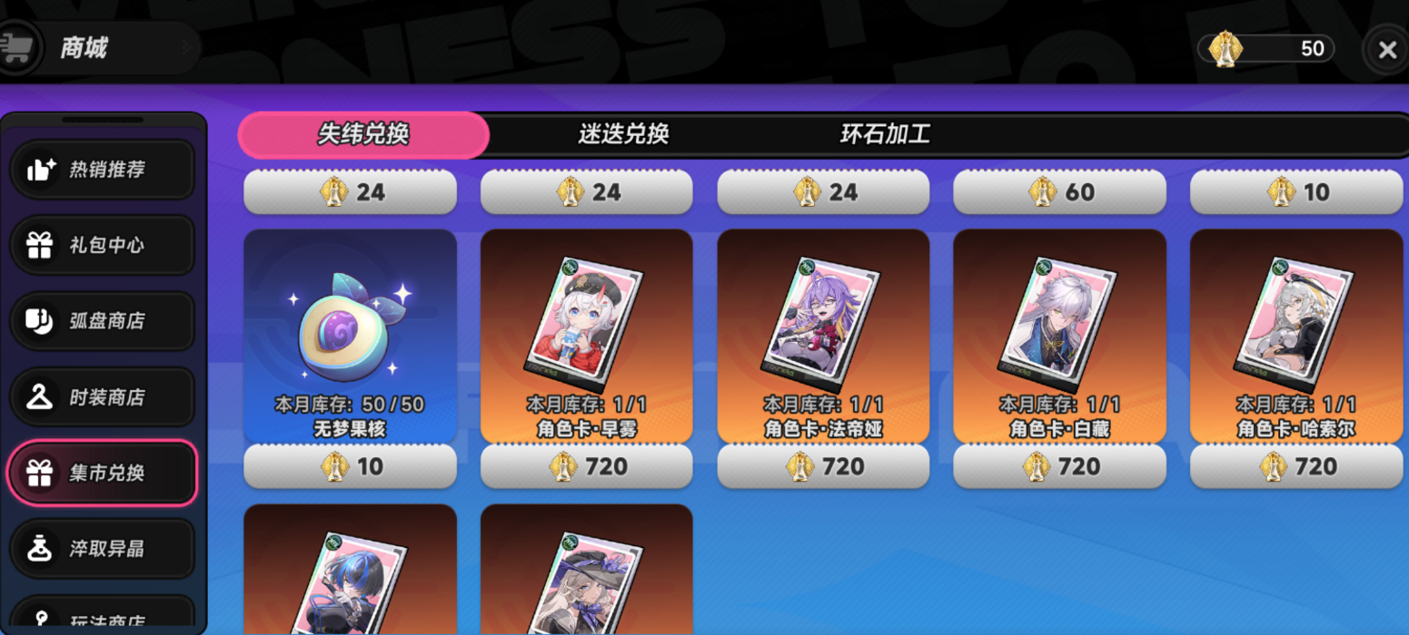 第二,集市骰子兑换系统。该机制独立于常规商店,采用棋盘式随机抽取设计:玩家掷骰前行,落点格子所对应奖励即为当次获取内容。其中,“失纬棋子”为高概率掉落物,可在集市专属兑换界面中按比例换取无梦果核,属于可控性较强的中期获取渠道。