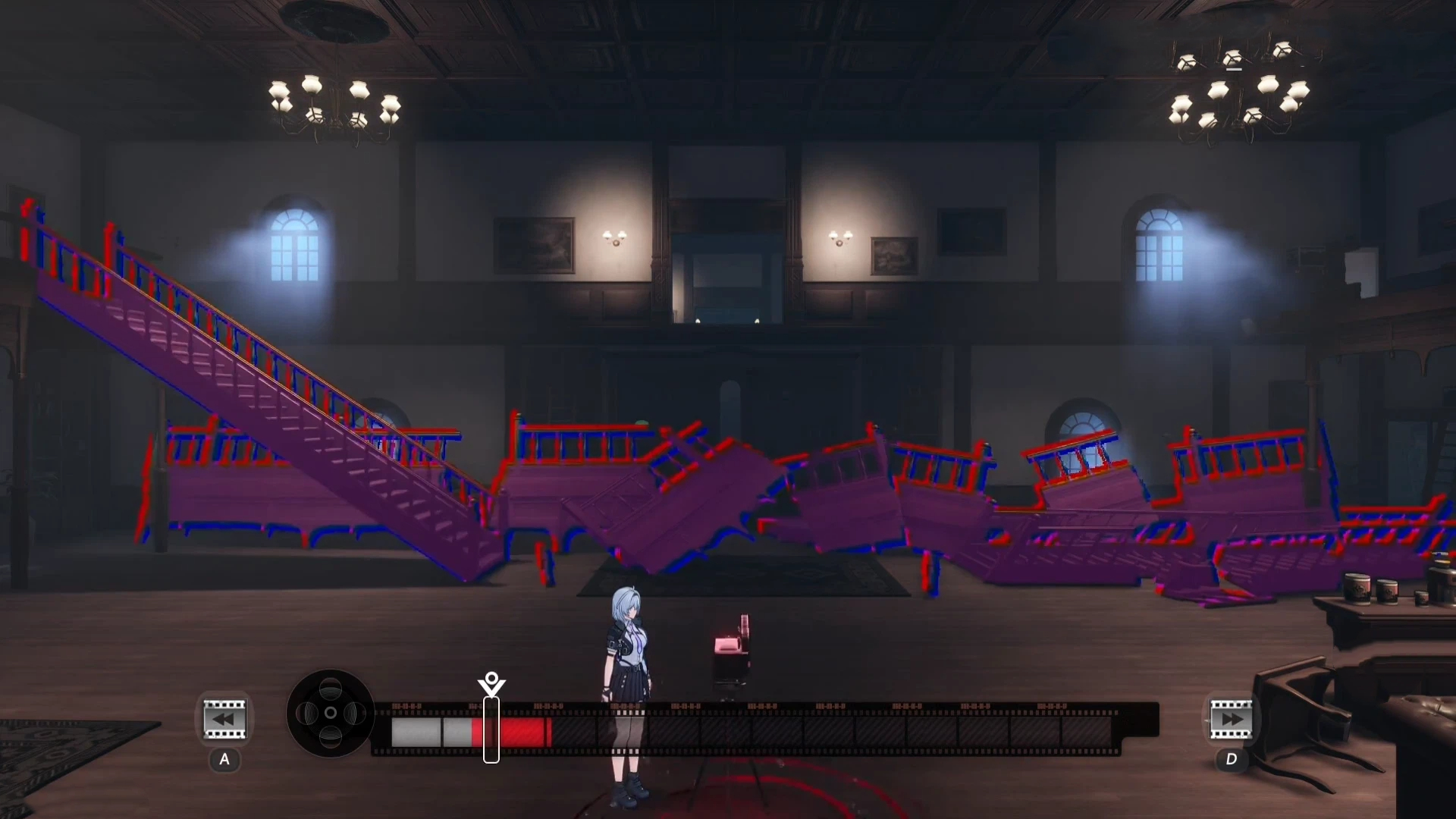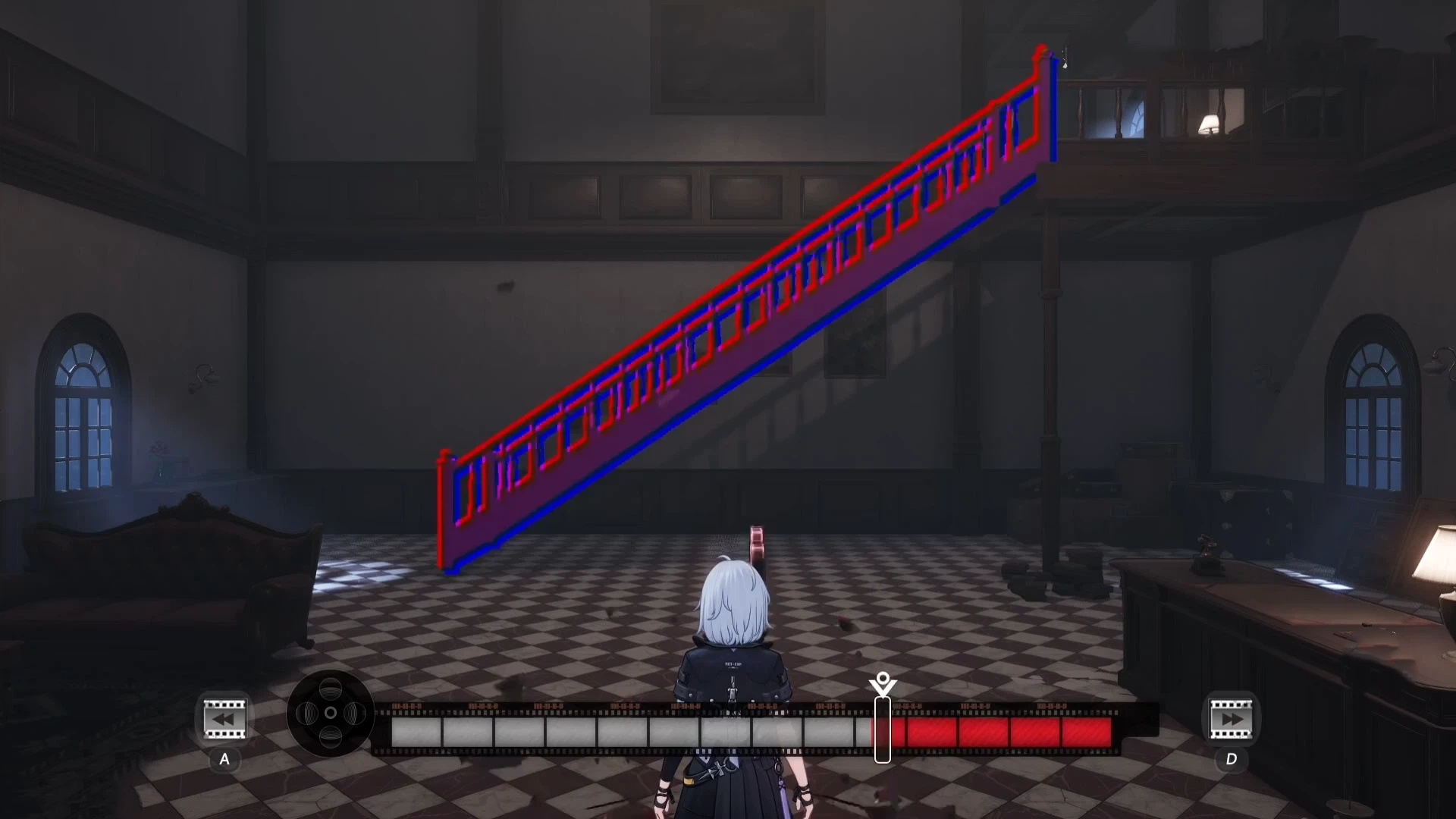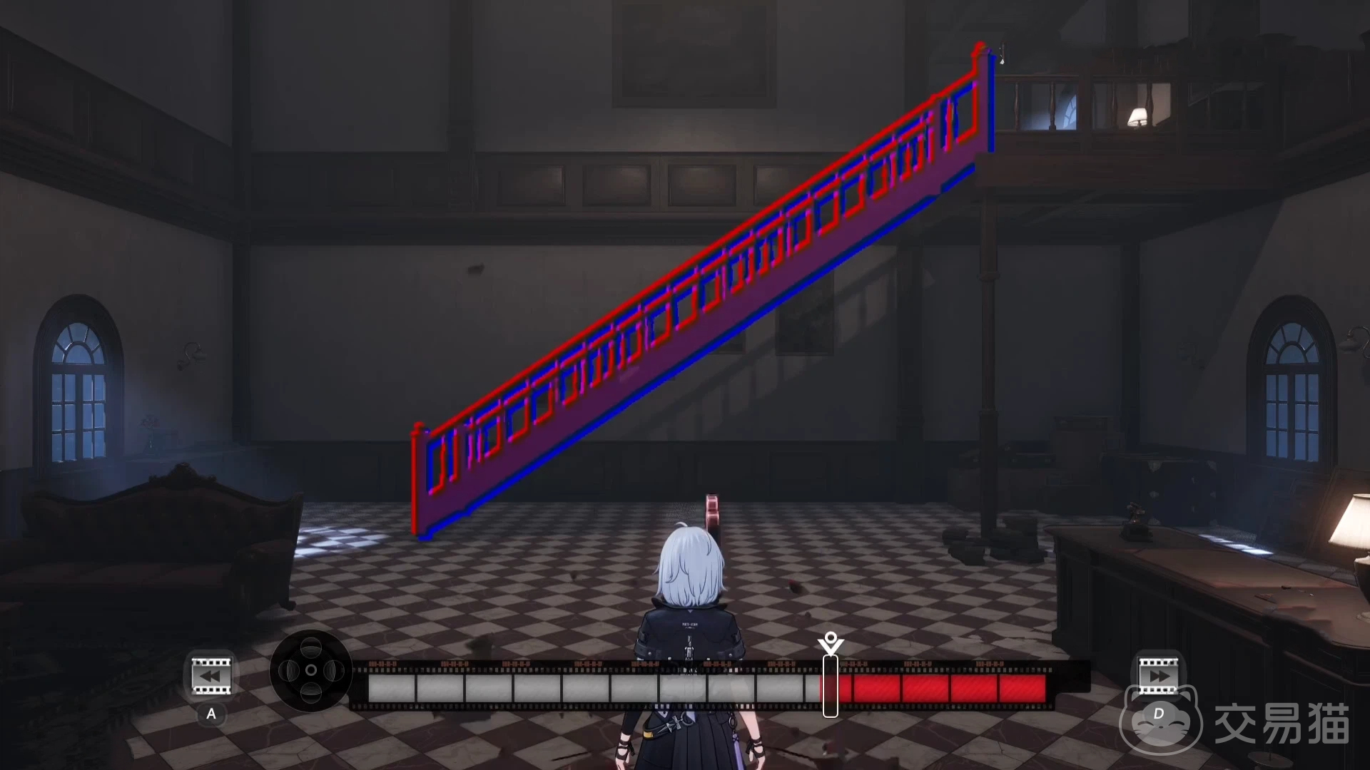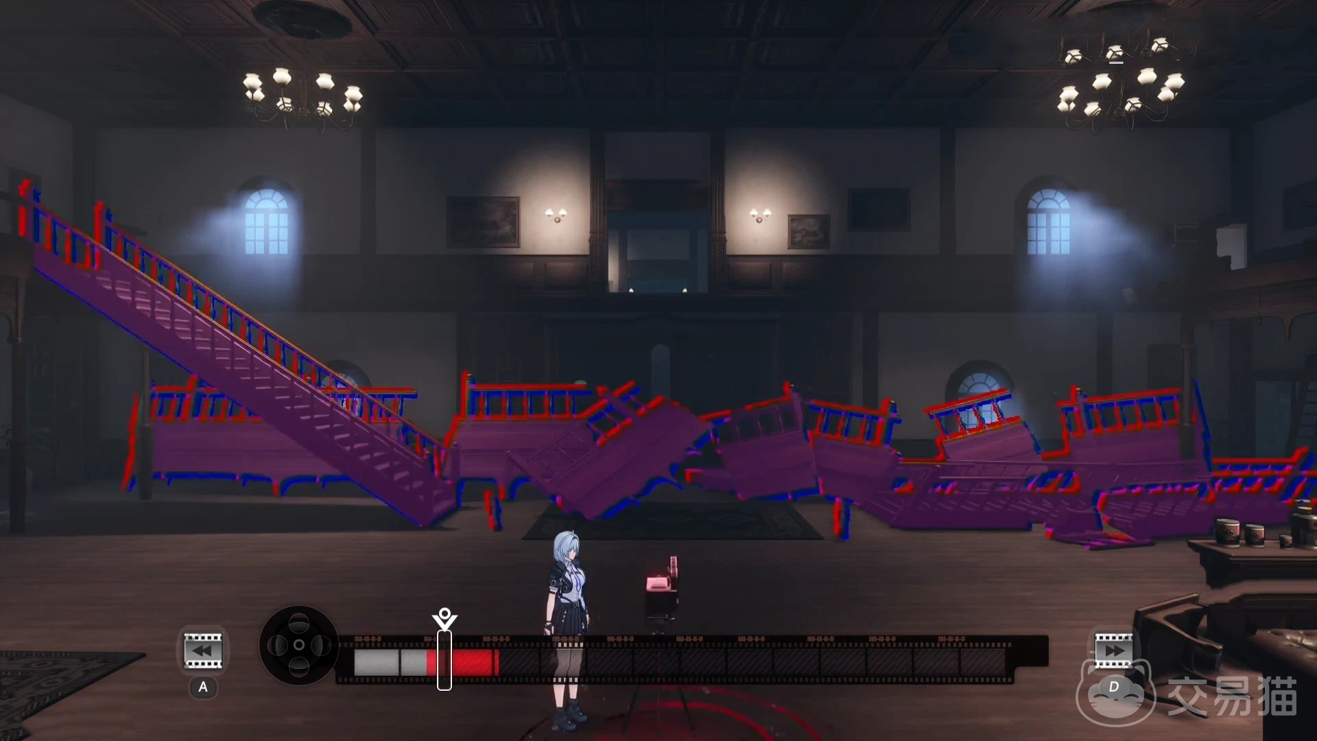 完成两次放映机对话后,系统将自动播放一段剧情影片。此时界面会出现可点击选项,触发后呈现一座断裂楼梯。玩家需操控放映机的时间轴,将影片回溯至特定帧位,使楼梯结构恢复完整形态,方可通行至二楼。抵达二楼后,与新出现的放映机互动时,需主动点击“关闭”按钮,才能解锁后续通道。此后若再发现放映机,与其对话会生成另一段破损楼梯,此时须将进度条精准拖动至标红位置,楼梯功能方可启用。