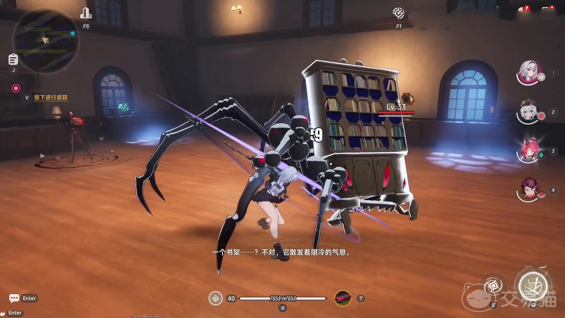通过楼梯后,第三台放映机将现身。依循前述逻辑调整影片时间轴,即可开启通往书架区域的大门。书架上显示的血条并非装饰元素,而是Boss战实时进度条。本副本首只Boss为大型蜘蛛型敌人,体型庞大但基础战力偏低,常规输出节奏即可稳定压制。击败该目标后,需折返至上一台放映机,重新校准时间参数,进而触发第二阶段Boss战。