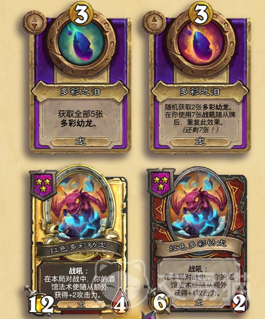 龙族体系同步升级,引入“多彩幼龙”关键词。每张多彩幼龙卡牌提供差异化增益效果,既可强化龙族随从的基础战力,亦能增强酒馆法术的生效强度与范围。该设定大幅拓宽龙系构筑策略空间,玩家可根据当前对局形势灵活选取适配幼龙,构建高响应性、强适应性的龙族阵容。