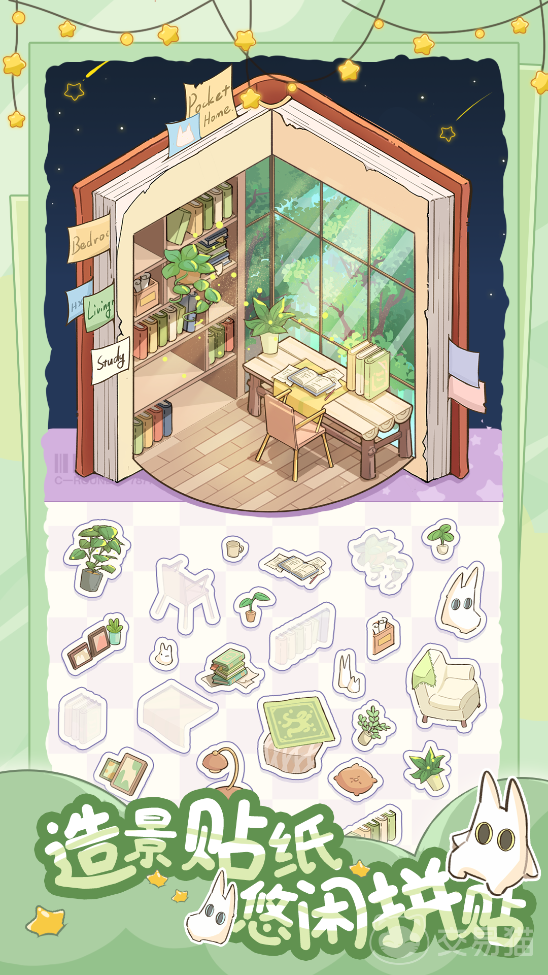 系统内置双模式调节机制:在“轻松模式”下,层级关系自动优化,新手可零学习成本快速上手;进入“挑战模式”后,图层逻辑显性化呈现,并提供智能构图提示,兼顾创意表达与结构逻辑训练。美术层面采用低饱和度水彩手绘风格,所有贴纸均为原创绘制,单张纹理细腻度达高清印刷标准。场景模块涵盖卧室、书房、花园、占卜屋四大主题空间,分别对应温馨、静谧、清新、神秘的情绪基调。