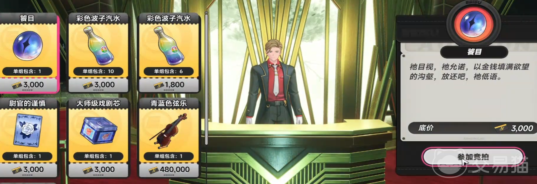 抵达卡佩大酒店后,需前往建筑入口右侧区域,与驻守于此的拍卖员进行交互,由此进入拍卖行系统。在拍卖行商品列表中,定位并选中道具【餮目】——该物品为激活玛门的必要媒介,起拍价固定为3000金币。后续需参与竞价小游戏完成最终获取,实际成交价普遍集中在7000金币区间。