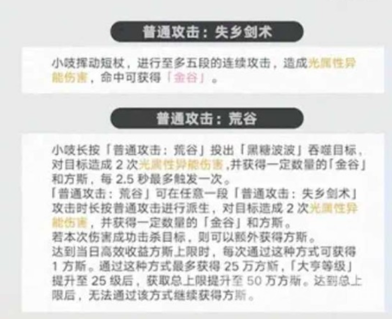 在「失乡剑术」任意一段攻击过程中长按普攻,可即时派生「荒谷」——投掷黑糖波波进行范围吞噬,造成两段光属性伤害,并同步获得金谷与方斯。该派生不依赖攻击段数完成,实现零帧衔接,大幅提升连招自由度与资源获取密度。此机制是小吱区别于其他角色的核心操作特征。