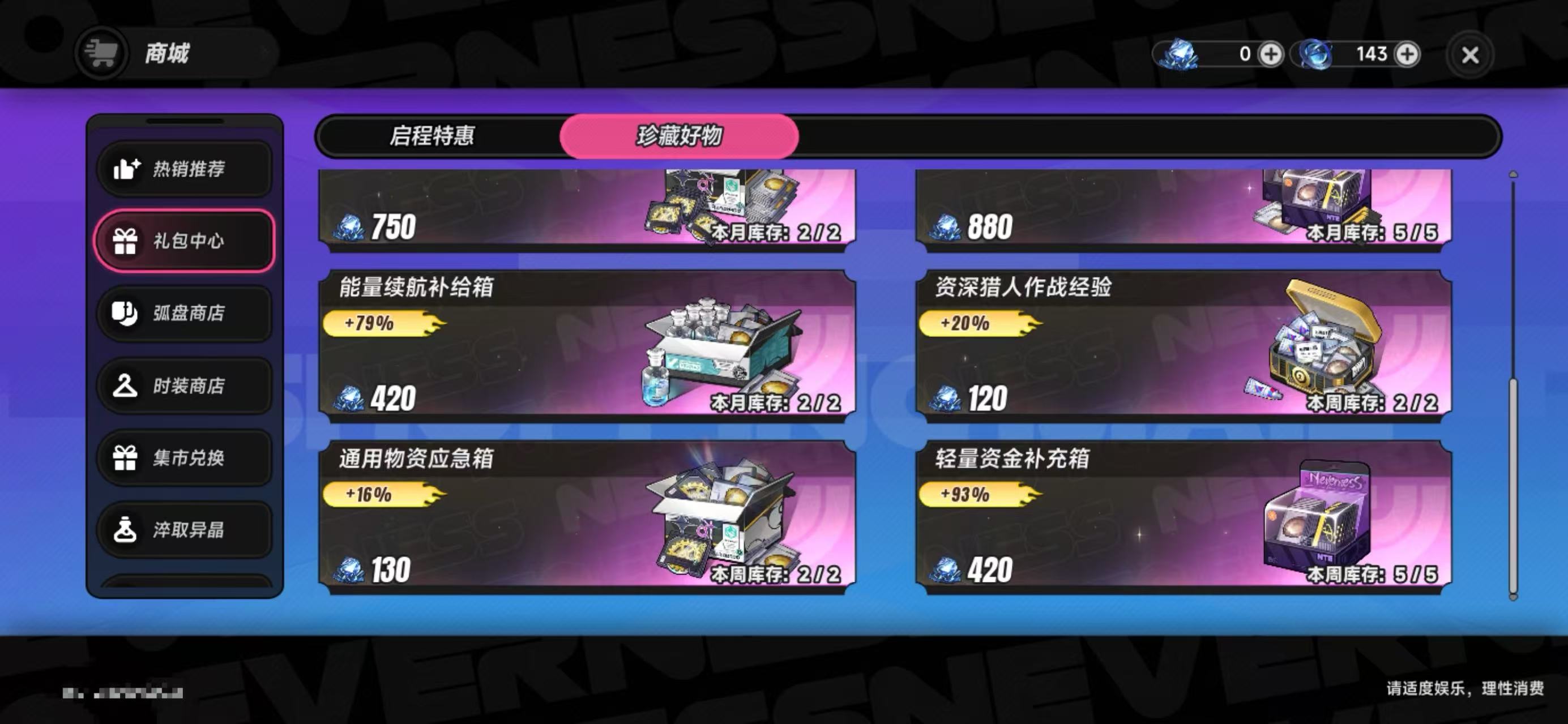 除上述三项外,珍藏好物还提供多档经验加成包、资金补给包、能量续航包等实用型周/月限定礼包,均设有独立购买上限,需玩家按周期及时完成兑换,避免额度清零造成资源损失。所有礼包均以异晶为唯一结算货币,不支持其他充值方式。