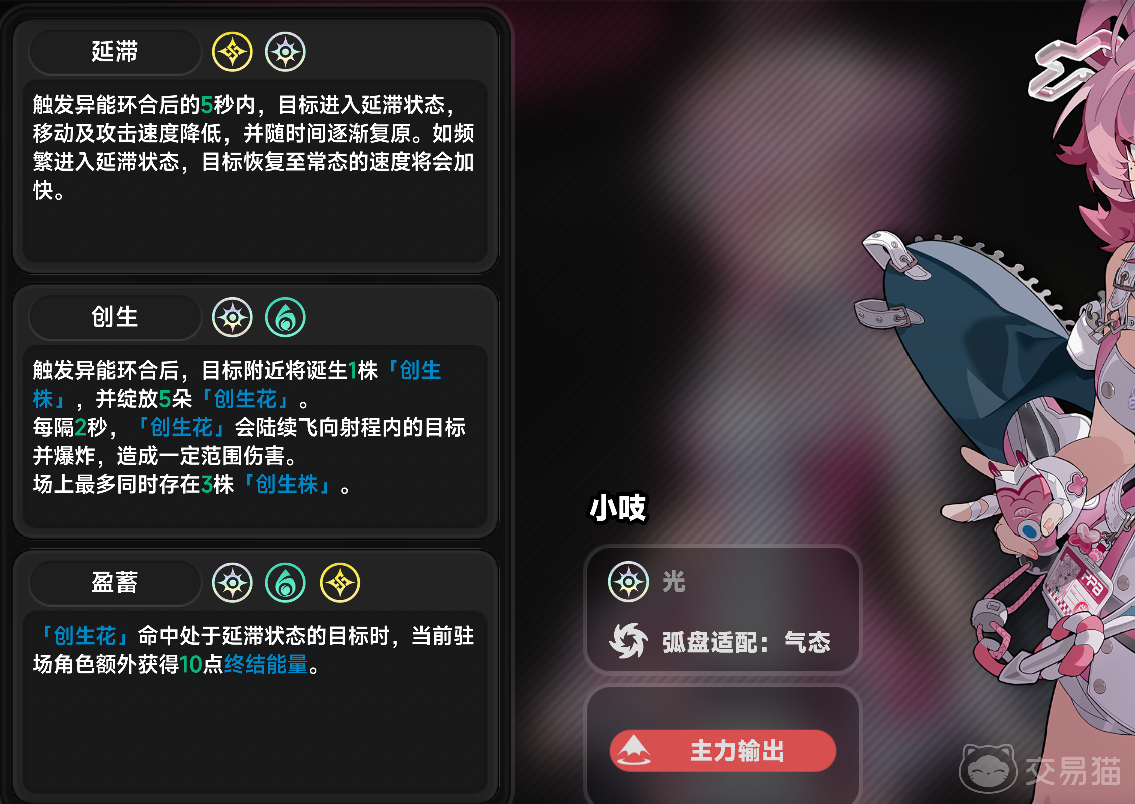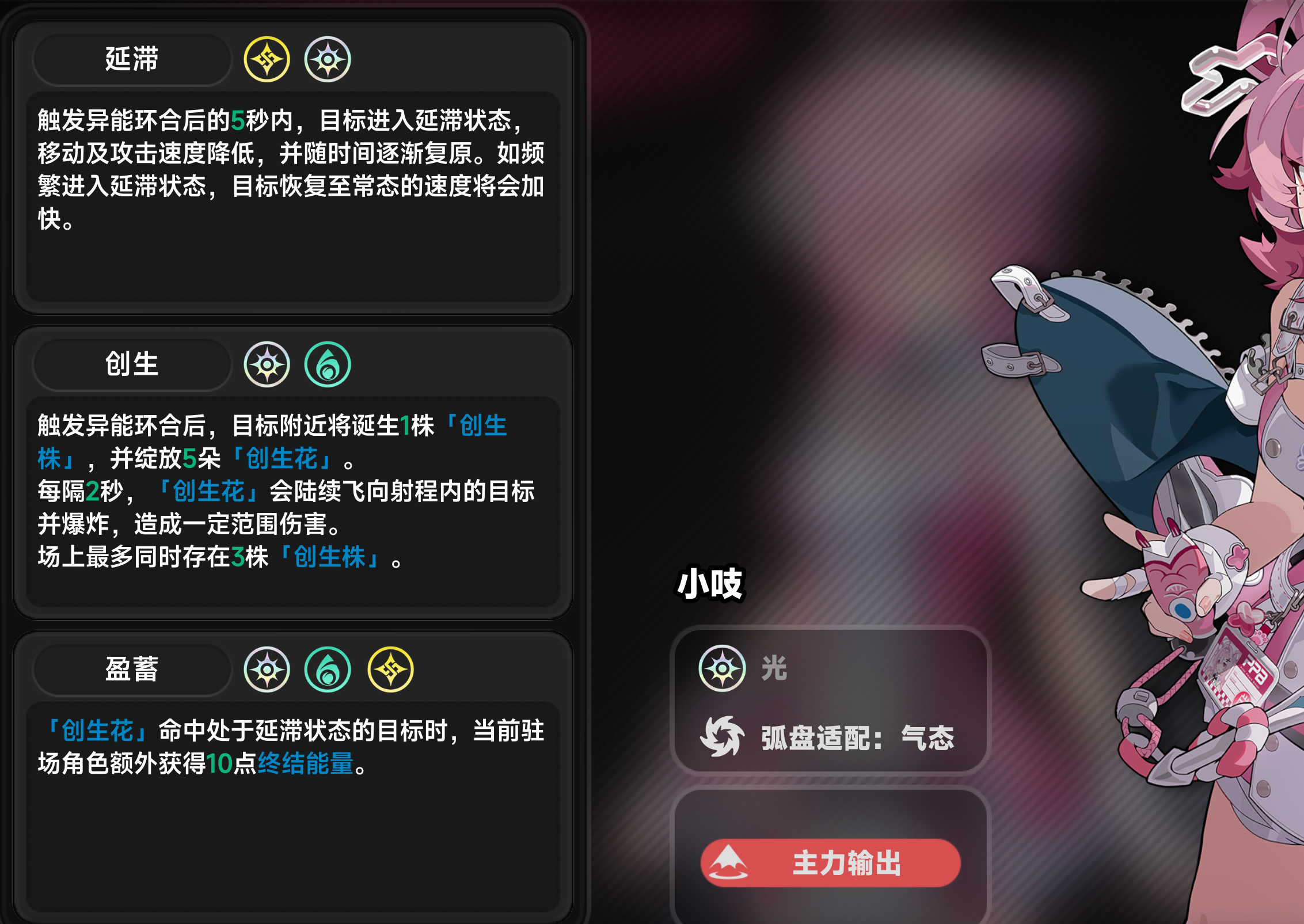 部分玩家反馈小吱实战输出未达预期,问题多出在队伍构建逻辑偏差。需明确:小吱为光属性角色,其强度上限并非依赖传统属性克制,而是高度绑定高阶环合反应——“盈蓄”。该反应触发条件为队伍同时配置光、灵、相三属性角色;生效机制为:当“创生花”命中处于“延滞”状态的敌人时,当前场上角色立即获得10点终结能量。这一效果可高频充能小吱大招,使其进入持续爆发节奏。
