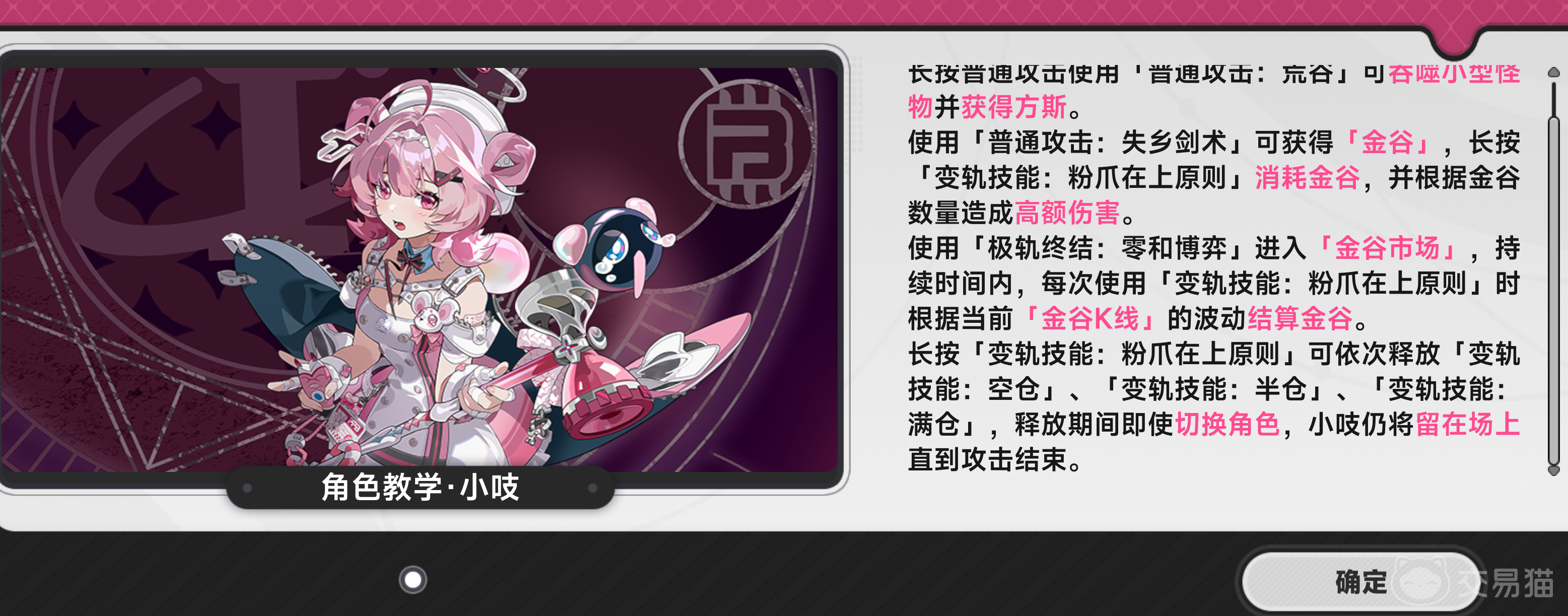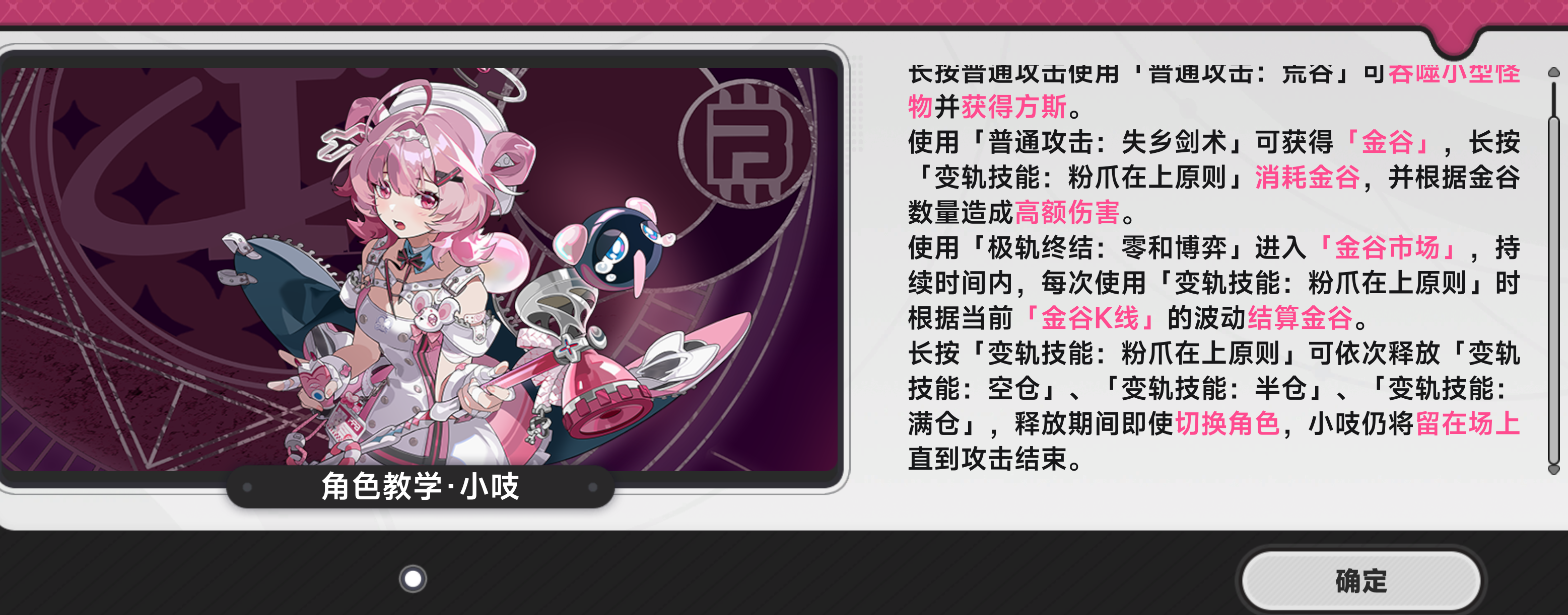 小吱的核心玩法围绕“金谷市场”系统展开,本质是一套资源循环驱动型战斗逻辑:普通攻击五段连击可积累“金谷”;长按攻击释放“黑糖波波”,在造成伤害的同时吸收敌方攻击并额外产出“金谷”与“方斯”;变轨技能作为主要输出手段,需消耗“金谷”发动,实现借力反制;终极技“零和博弈”则直接激活金谷市场,瞬时获取高额“金谷贷款”,大幅提升爆发阶段的伤害总量。