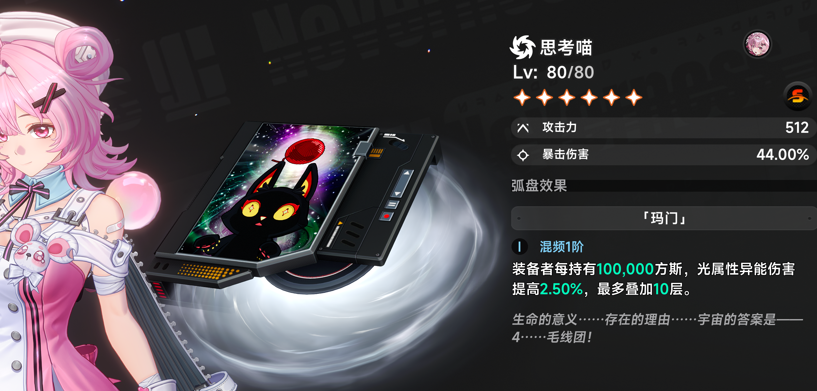 武器选择上,优先使用专武“思考喵”:其特效根据角色当前携带的“方斯”数量提供光属性增伤,每1点方斯提升1.5%,最高叠加15层,即总计22.5%光属性伤害加成。鉴于小吱常态产出方斯效率极高,该武器几乎全程满叠,收益稳定。若暂无专武,可选用四星武器“明光之瞳”作为过渡方案。