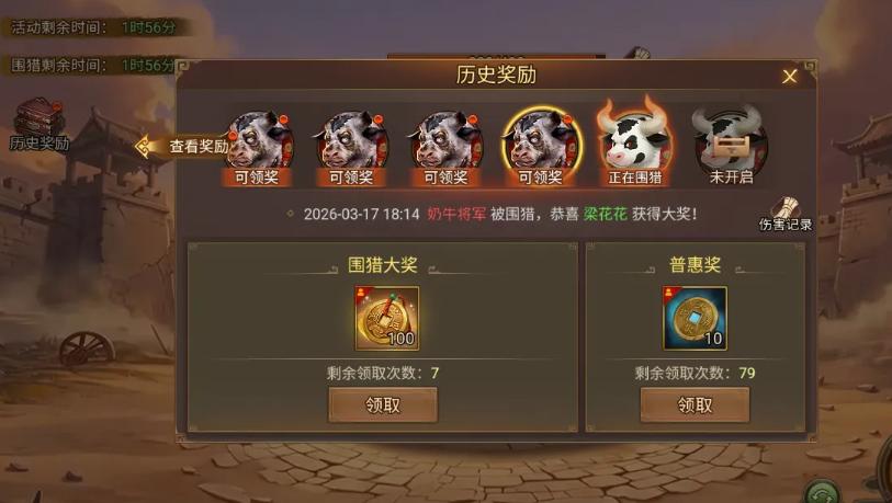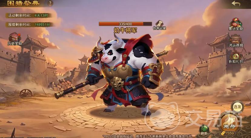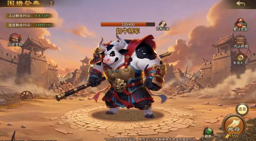 “围猎祭典”则主打轻度共斗体验,场景设定于益州郊外。玩家需使用符咒降伏奶牛将军,每次成功释放可削减其1点血量并获得对应奖励。活动入口位于主界面左上角“福利”按钮左侧。每日开放时段划分为围猎期(07:00–次日01:00)与休战期(01:00–07:00)。符咒获取方式包括每日登录签到及金玉商店兑换等常规运营渠道。