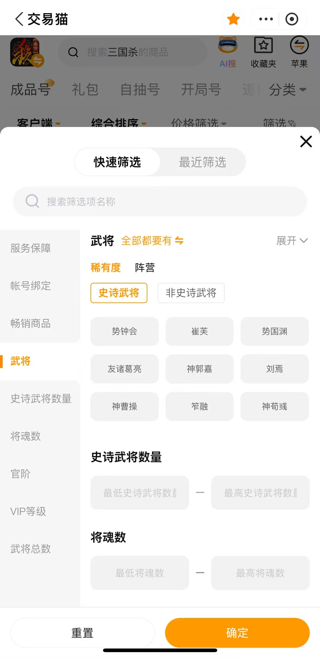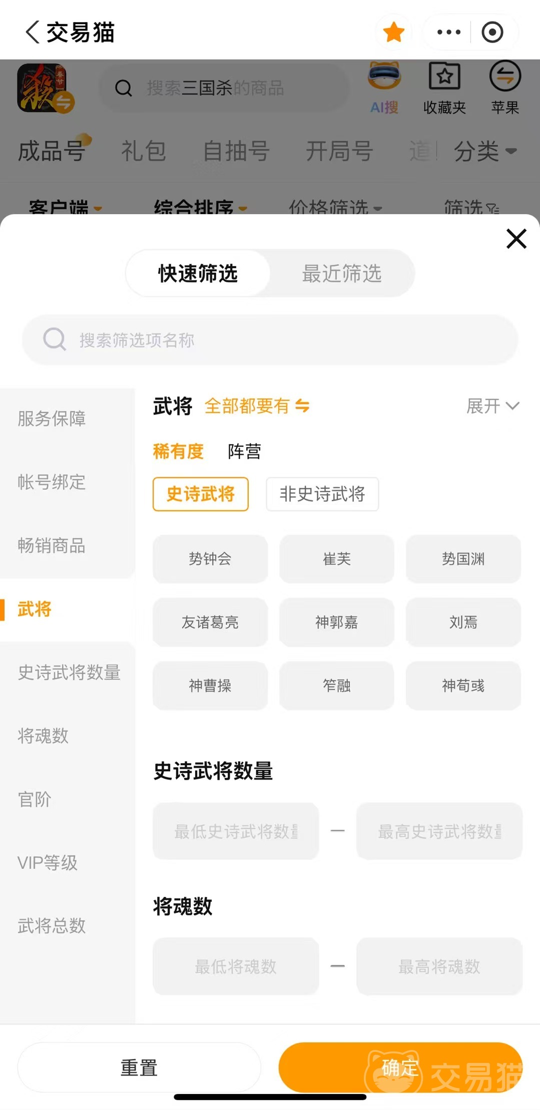 交易猫针对三国杀买号玩家提供一站式的服务,安卓用户可以直接点击上方的链接即可下载APP,iOS用户可以搜索进入交易猫官网直接使用。平台专门开设了三国杀的专区,支持武将数量、皮肤稀有度和段位等条件的精准筛选,只需要几分钟就能够锁定自己的目标账号,不用在海量的商品信息里面找,大幅度提升买号的效率呢!