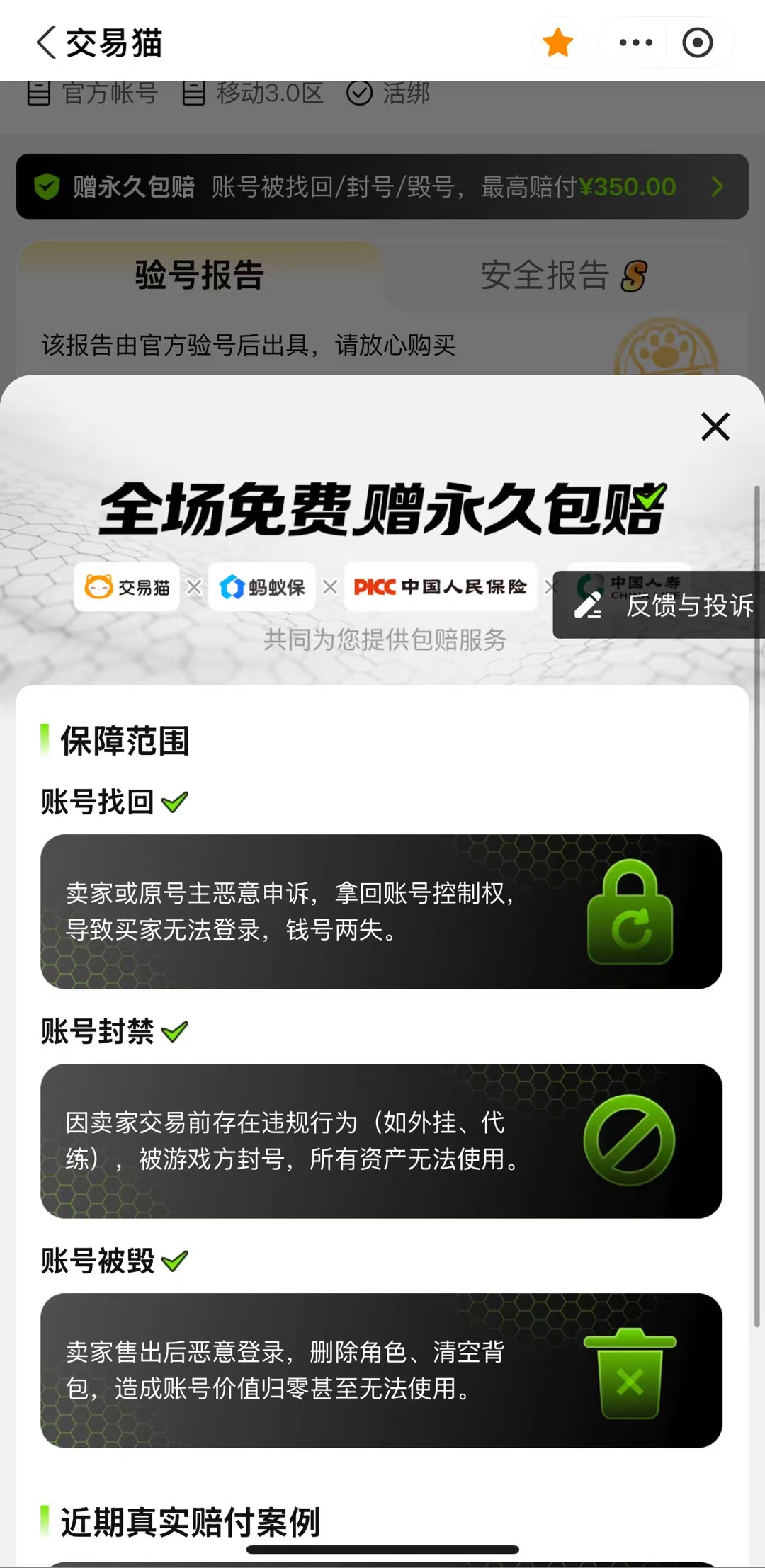 交易猫的安全保障直接拉满,全方位的守护买家的交易权利。资金与账号的双重监管,安心购搭配永久包赔,不管是出现了账号被卖家恶意找回、账号实际信息与商品描述不符合、还是账号存在封禁隐患等情况,买家均可以发起赔付申请,平台经过核实之后都会赔付,杜绝买家损失。而且所有上架的账号都是经过官方验号的,卖家上架账号的时候都需要提供完整的账号基础信息,游戏截图,道具装备详情等真实的资料,然后由验号工作人员核实之后会生成一个完整的验号报告,买家可以逐一核对,避免买到黑号、假号。