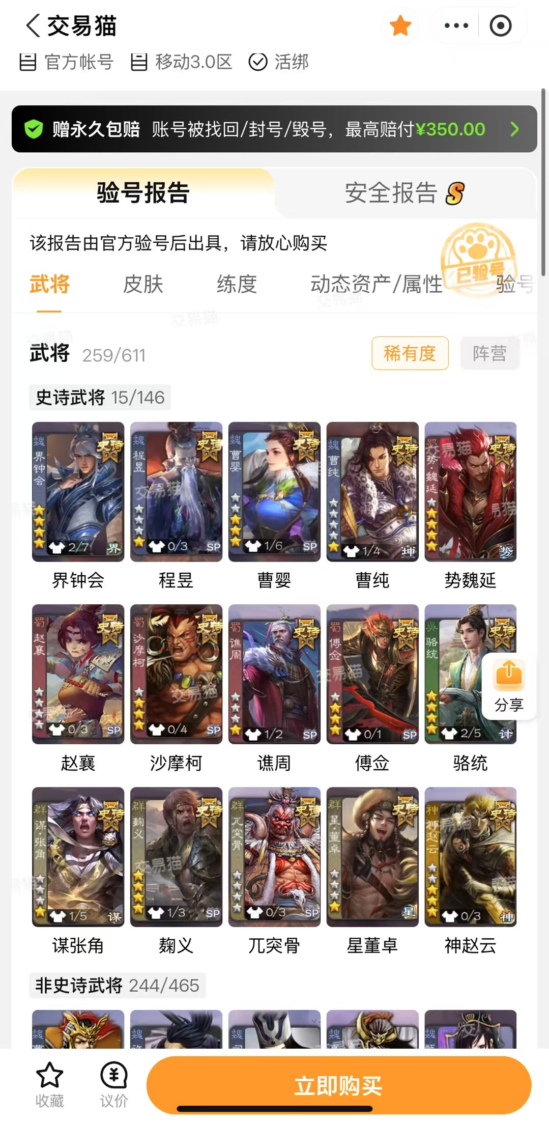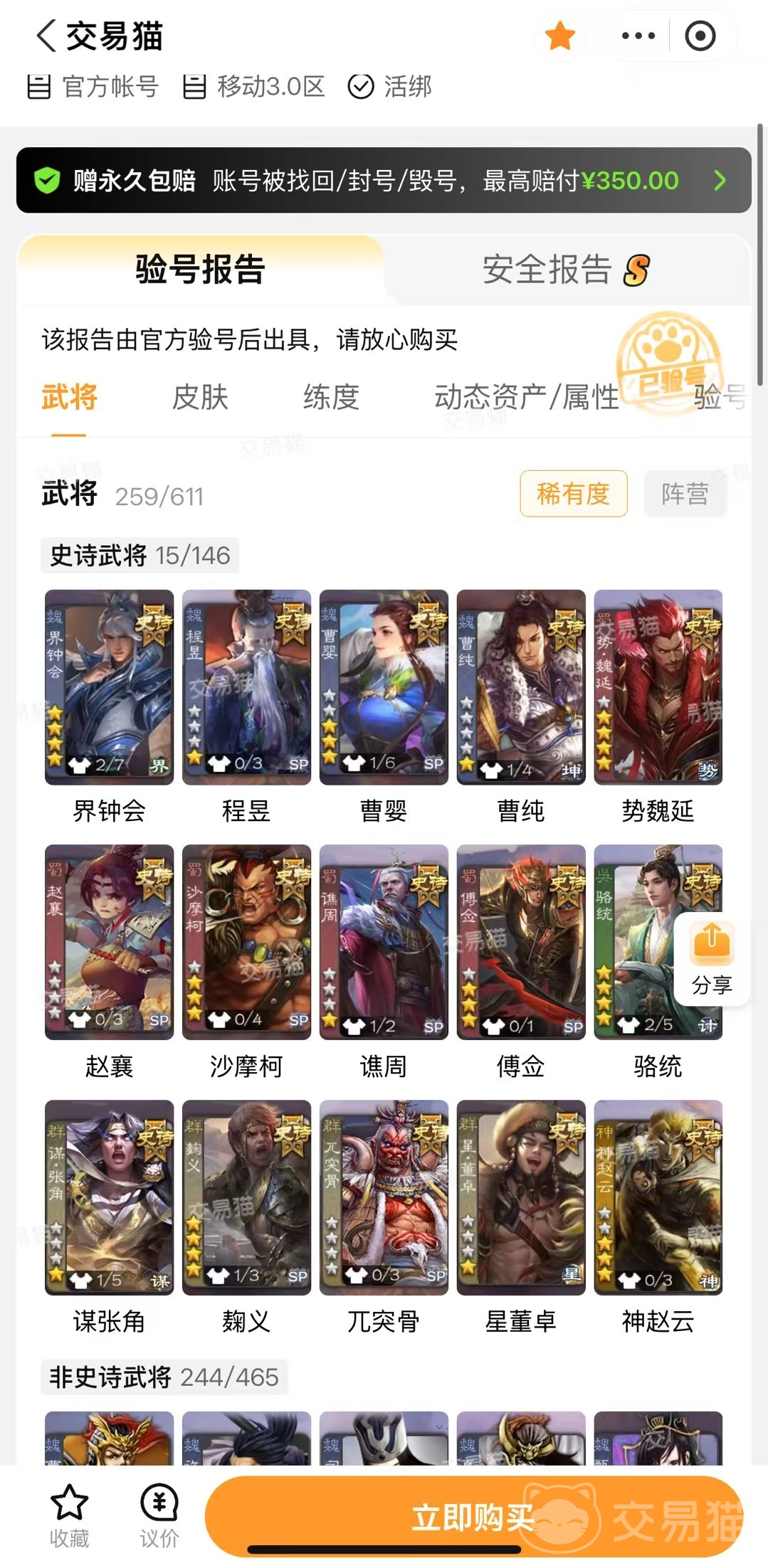 不管你是想要补全武将,收集皮肤,还是想要快速的冲排位,体验高端账号,三国杀买号平台选交易猫包你找到心仪的选择。丰富的账号资源和透明的定价体系、简洁的交易流程,不用为账号的安全和性价比纠结,轻松就能够挑选到合适的账号,全身心投入游戏乐趣。