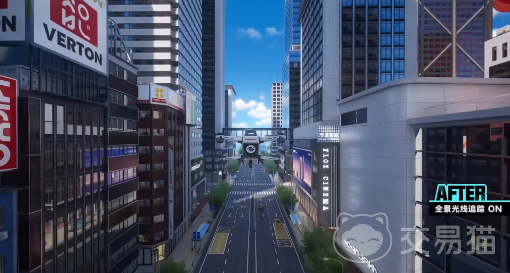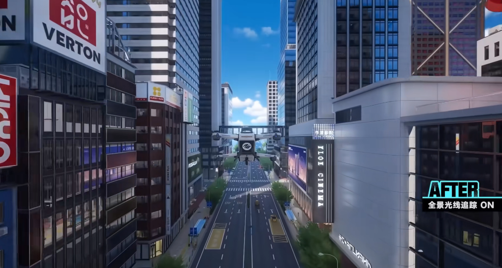 实测显示,光追技术在多类环境场景中均展现出显著提升:雨雪天气下物体表面的漫反射过渡更自然;不同材质建筑的镜面反射细节丰富,边缘光影衔接平滑;动态水体可实时生成高精度倒影,波纹扰动与光源角度高度同步;云层渲染具备多层透光结构,明暗层次分明,体积感突出。这些改进共同强化了整体场景的空间纵深与物理可信度。