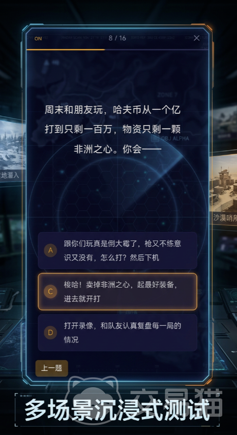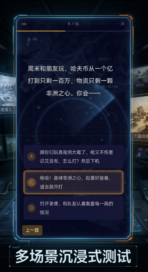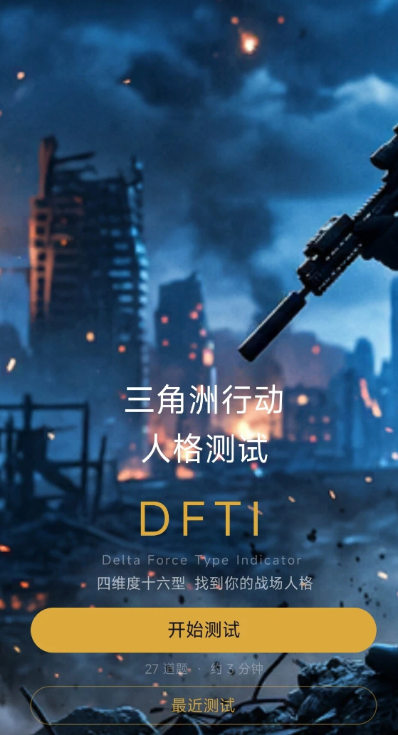 本作定位为轻量级心理倾向评估工具,不设操作门槛,无战斗、养成或资源管理等复杂系统。进入主界面后即刻启动测试流程,全程共20余道情境选择题,所有题目均围绕战术协作、危机响应、团队角色偏好等《三角洲行动》核心玩法场景设计。建议玩家依据直觉反应作答,避免过度权衡,以保障结果对原始行为倾向的映射精度。