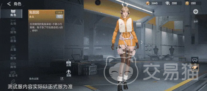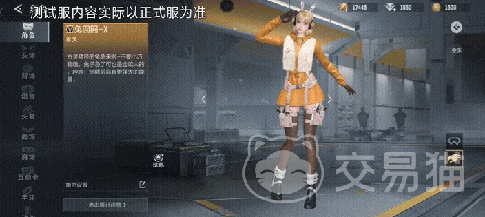 兔囡囡拥有保卫者与潜伏者两套独立建模造型。保卫者形象采用蓝白主色调,身着毛绒质感短外套与百褶裙,双丸子头搭配白色耳机,整体呈现甜酷融合的视觉风格;潜伏者版本则以明黄色连体战术服为基础,外搭白色马甲与模块化战术腰封,短发造型结合可动兔耳耳机,凸显干练利落的战斗气质。两套外观在角色界面中均支持360°自由旋转查看,细节刻画精细。