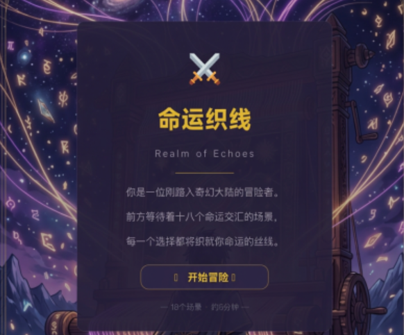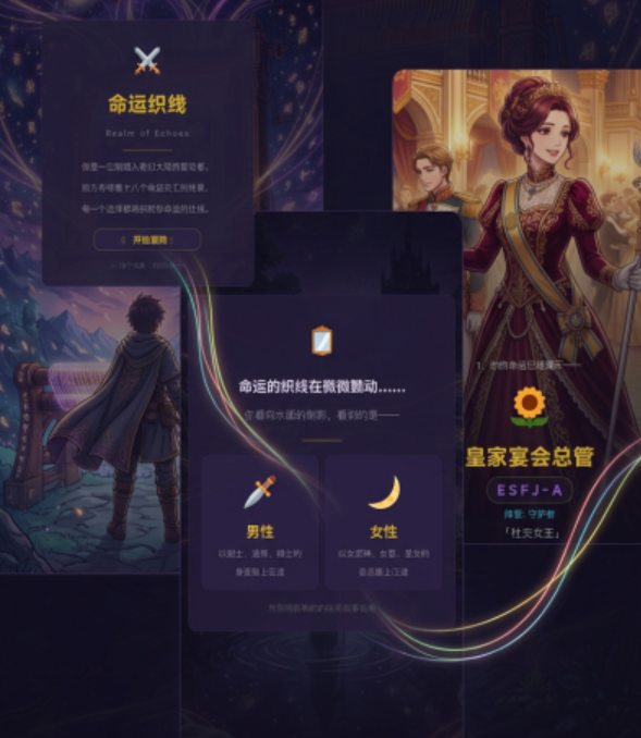 性格测评工具正逐渐告别传统问卷形式,转向更具沉浸感的互动体验。这款名为“命运织线”的MBTI性格测试产品,创新采用文字冒险游戏机制,将心理测评深度融入奇幻叙事中——玩家不再面对枯燥选项,而是以主角身份进入一段命运交织的旅程,在关键情境中做出选择,从而自然触发对应人格维度的判定逻辑。