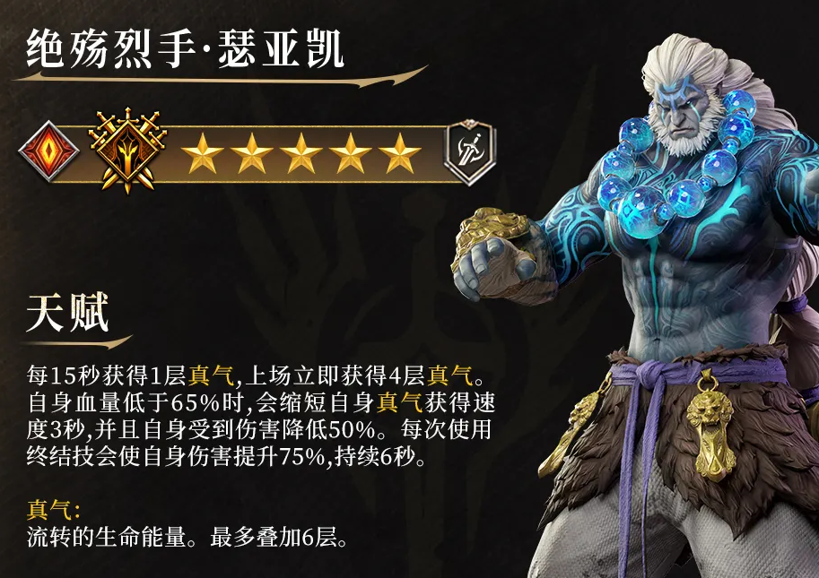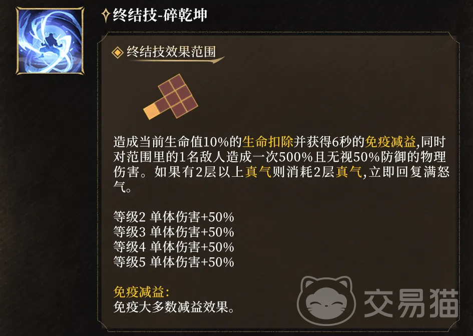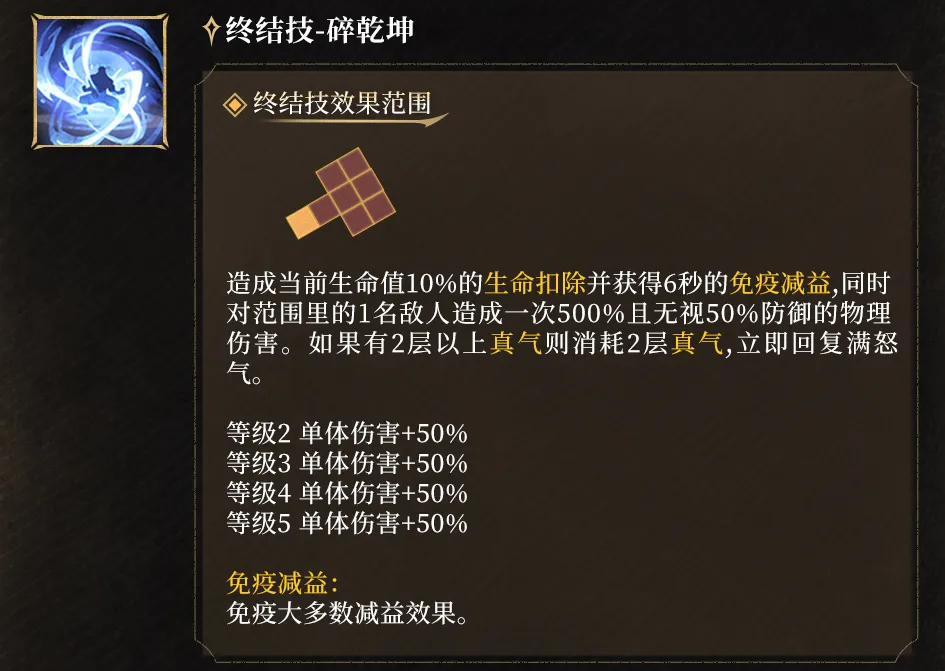 终结技“碎乾坤”是整套输出循环的枢纽:释放时先扣除10%当前生命值,随即获得6秒减益免疫,并对单体目标造成500%物理伤害,同时无视目标50%防御。若此时真气层数≥2,则自动消耗2层并立即恢复全部怒气值。这一设计使连续终结技成为可能——只要真气充足,即可在短时间内打出两轮高额爆发,精准压制敌方关键单位。