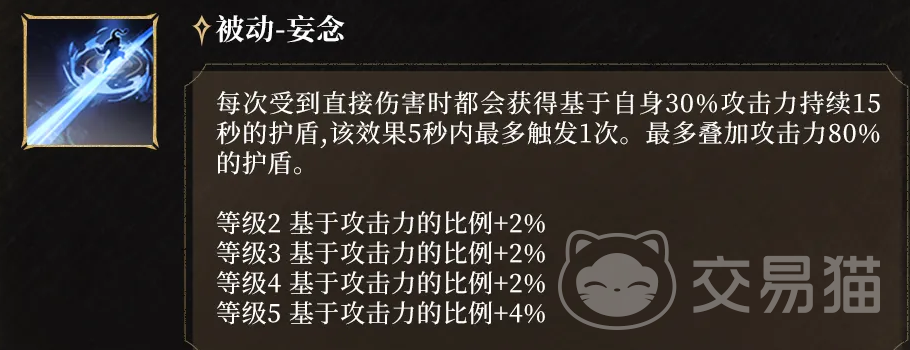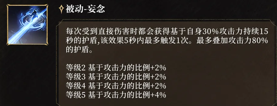 被动“妄念”提供持续性防护:每次受到伤害后,生成相当于30%攻击力的护盾,持续15秒,5秒内仅生效一次;护盾总量最高可达攻击力的80%。该数值随攻击属性成长而同步提升,实现输出与生存能力的正向耦合,显著降低操作容错压力。