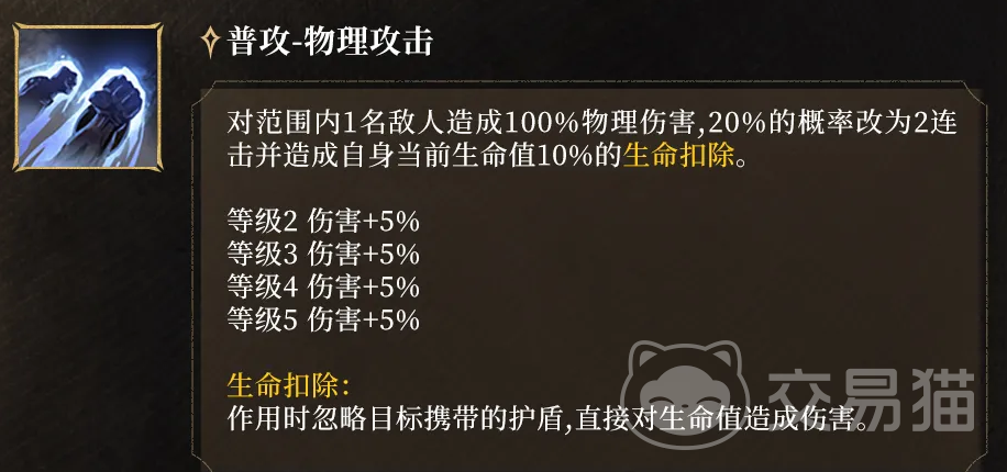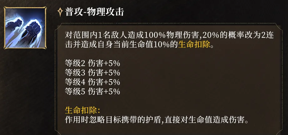普通攻击基础伤害为100%物理攻击力,但附带20%概率触发双段连击。该效果会强制扣除施放者当前生命值的10%,且该扣血不可被护盾抵消。此机制虽具风险性,却是激活被动护盾的关键前置条件——合理规划普攻频率,可将生命损耗转化为生存增益,形成攻防闭环。