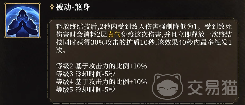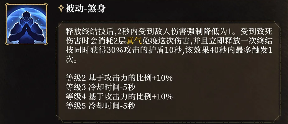另一被动“煞身”则聚焦极限生存:终结技释放后2秒内,所有所受伤害强制降至1点;若遭遇致死伤害,将消耗2层真气免疫本次致命打击,并立即反向释放一次“碎乾坤”,同时生成相当于30%攻击力的护盾。该效果每40秒最多触发一次,构成团战中扭转战局的核心保底手段。