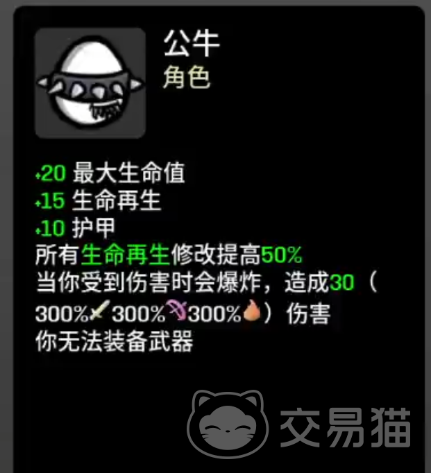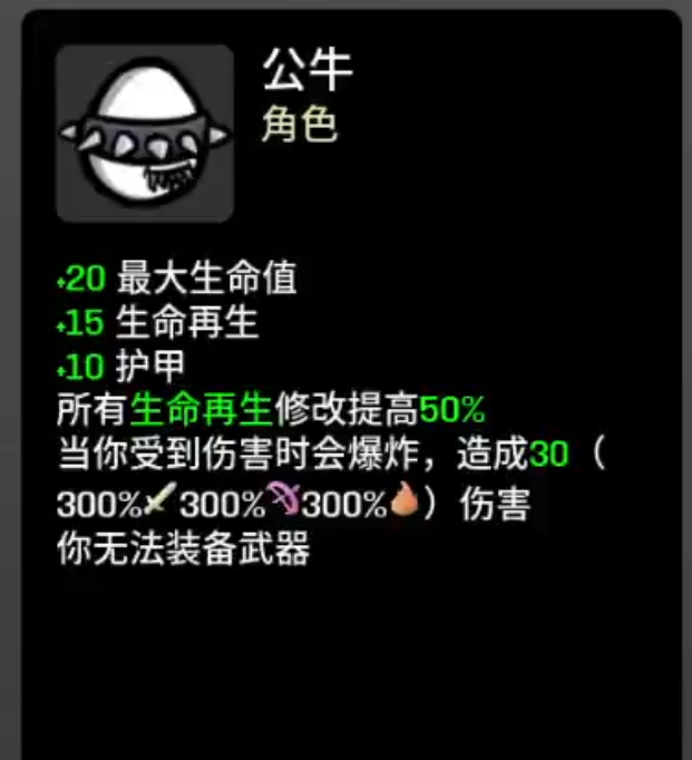 除幸运星外,《土豆兄弟》中还有多个机制鲜明的角色可供选择。例如“独臂”,其解锁门槛为完成难度0关卡,并在该局中获得红色品质道具,同时触发攻击速度翻倍效果,且支持携带武器,操作逻辑简洁直观,适合偏好高效输出与低操作负担的玩家。“公牛”的解锁条件为通关难度1关卡,并在过程中获取地精系红色装备,拥有高额生命值与护甲,受击时可触发范围爆炸伤害,在持久战与容错率方面表现优异。