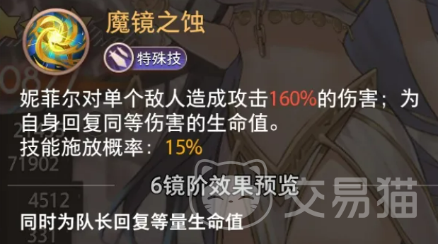 特殊技能“魔镜之蚀”为单体定向技能:对指定敌人造成160%攻击力的伤害,并基于实际造成伤害值等额恢复自身生命。当技能升至6阶后,额外为队长同步恢复同等数值的生命值。该机制使其在持续作战中具备自我续航能力,亦可在特定配队下强化团队生存韧性。