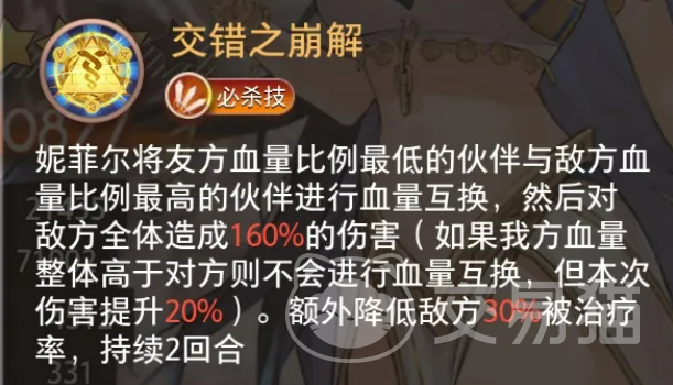 必杀技“交错之崩解”是其战术核心:对敌方全体造成160%攻击力的伤害,并强制交换敌我双方当前血量最高与最低单位的位置。此外,该技能还会使全体敌人在后续两回合内受到的治疗效果降低30%。这一设计不仅具备爆发输出能力,更通过位置重置制造战局变量,例如将敌方满血前排与我方濒死角色调换,从而逆转集火节奏或规避关键控制。