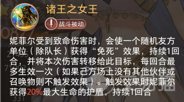 她的被动技能“诸王之女王”赋予其高容错率:当妮菲尔即将承受致命伤害时,该伤害将被强制转移至我方随机一名队友,同时自身获得相当于最大生命值20%的护盾。该效果每回合仅可触发一次,但能有效延长其战场存续时间,为队伍争取关键行动窗口,属于典型的防御向反制机制。