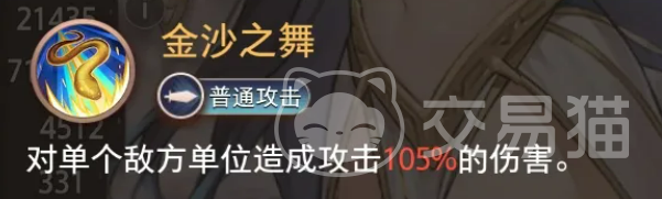 普通攻击“金沙之舞”为基础单体输出手段,稳定造成105%攻击力的伤害。虽无附加效果,但在技能轮空或资源受限阶段,仍可维持基础压制力与能量积累效率。