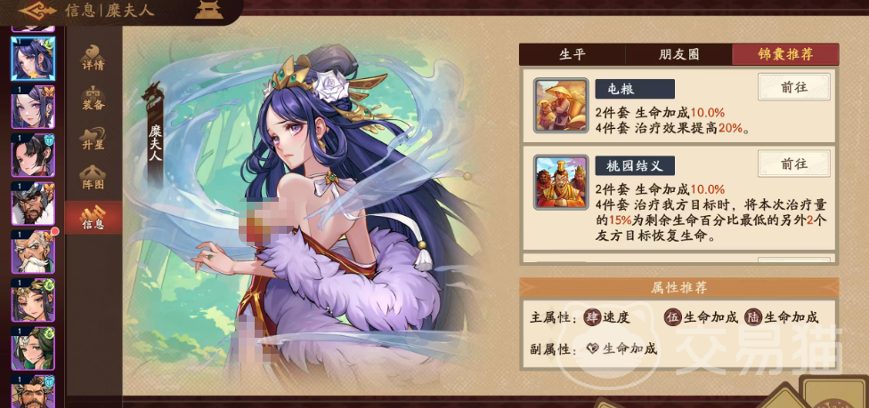 装备搭配方面,推荐优先选用专属溯影【江东凤仪】。该溯影提供12%基础生命加成,并使携带者治疗效果提升10%;治疗溢出部分可转化为护盾,护盾量为治疗量的10%,上限为受护目标最大生命值的20%。该机制与糜夫人高频次、大范围的治疗特性高度契合,进一步放大其生存保障能力。