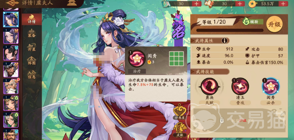 【闺秀】作为核心必杀技,兼具治疗与输出双重属性:对我方全体恢复相当于糜夫人最大生命值7.5%+75点的生命;同时附带暴击伤害判定,可在维持团队生存的同时提供一定战术压制力。该治疗无站位限制,覆盖全部己方单位,彻底规避传统群体治疗因阵型分散导致的覆盖率不足问题。