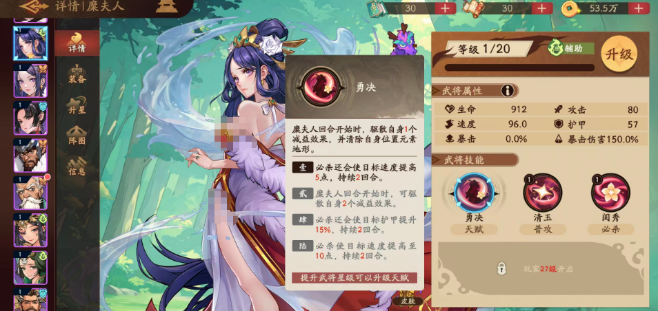 糜夫人的定位清晰——专精于辅助协同。其天赋【勇决】是整套机制的基石:每回合开始时,自动驱散自身1个减益状态,并清除所在位置的元素地形影响。该效果使她能有效对抗敌方以火、冰、雷等元素地形构建的压制体系,保障己方行动自由度。当达成1命后,在天赋加持下,其必杀技【闺秀】可为目标提升5点速度,持续2回合;该增益具备延展性,随命格提升逐步强化。