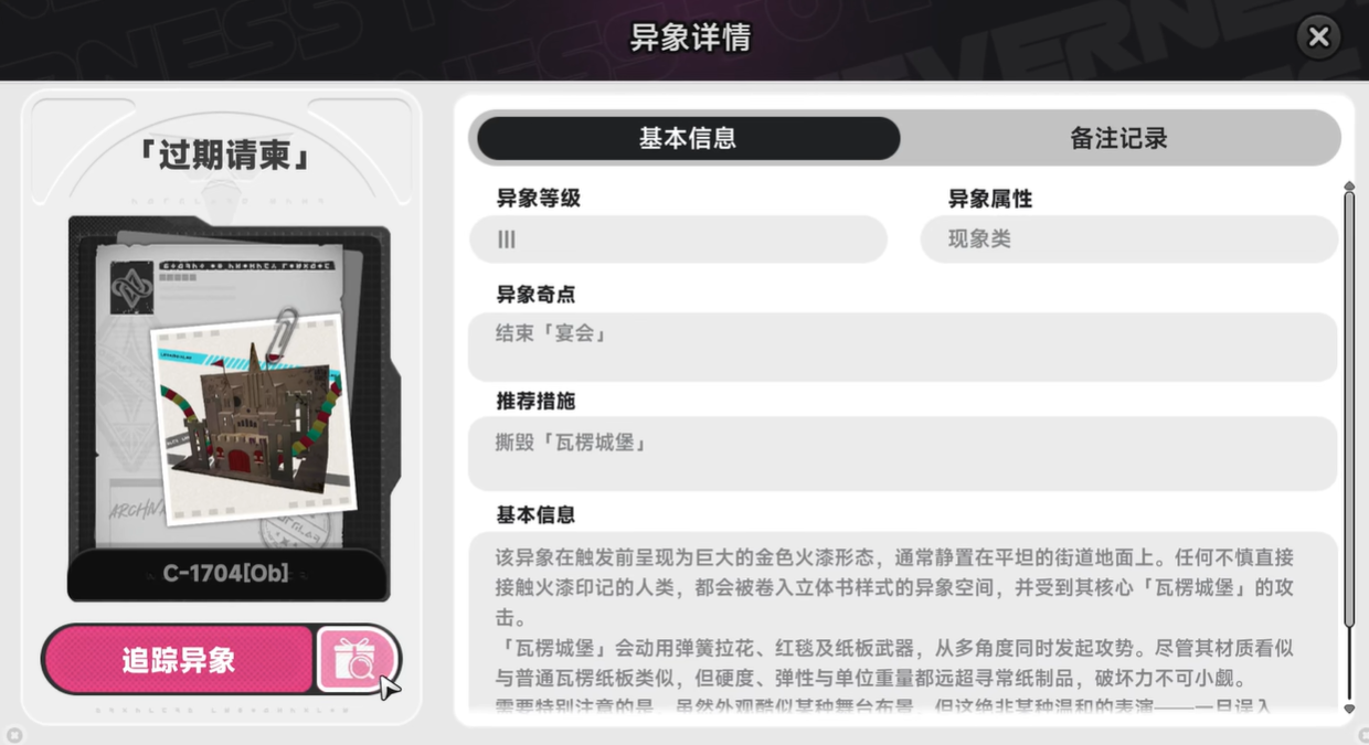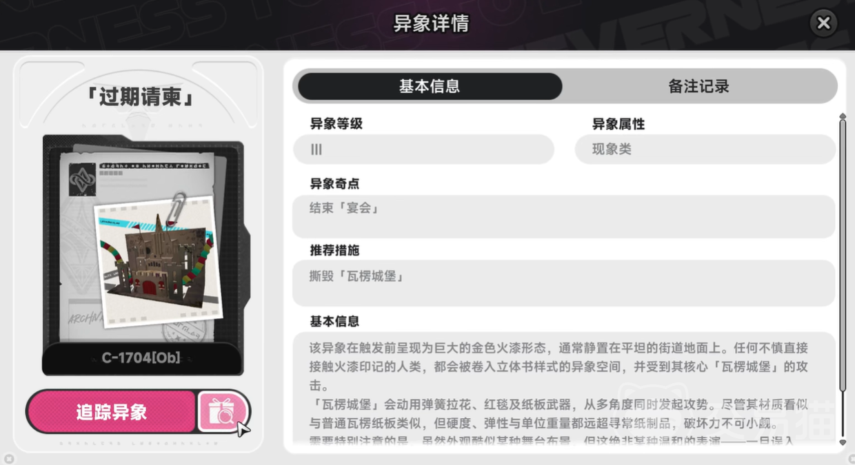 过期请柬为光属性立体书造型异象,外观呈纸艺城堡结构,具备强韧护甲与多段组合技。其基础战力门槛较高,建议队伍平均等级达20级,并完成核心角色的装备强化与技能升级。属性克制方面,暗属性角色对其伤害加成显著,推荐优先编入主力阵容。同时需提前储备破韧类技能资源,以应对BOSS下方持续显示的韧性条机制。
