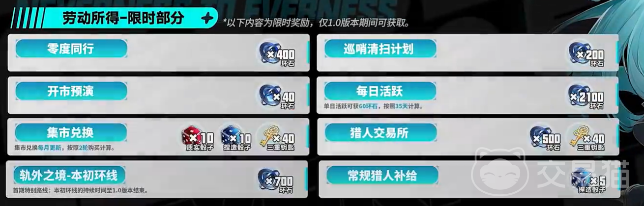 常驻类劳动所得则面向长期可持续投入的内容。地图探索覆盖大量足迹点与隐藏宝箱;猎人等级与鉴定等级需逐级突破;成就系统设有多层级目标;角色突破阶段提供固定资源回馈;轨外之境作为高难度挑战玩法,配合集市材料兑换体系;都市闲趣模块整合打工、模拟经营、竞速赛车等轻量玩法,均可稳定产出资源。